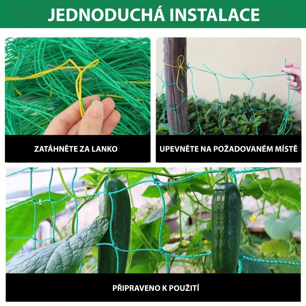 Opěrná síť pro popínavé rostliny je ideální pro pěstování veškeré popínavé zeleniny a zahradních rostlin. Opěrná síť pro popínavé rostliny zvyšuje úrodu, prodlužuje plodnost rostlin a oddaluje napadení plísňovými chorobami.Síť je ideální na okurky, hrách, fazole, chmel, rajčata nebo různé druhy popínavých květin. Opěrná síť je vhodná i na upevnění popínavých rostlin při zdech a plotech.Opěrná síť je odolná vůči UV záření, vlhosti a povětrnostním vlivům.