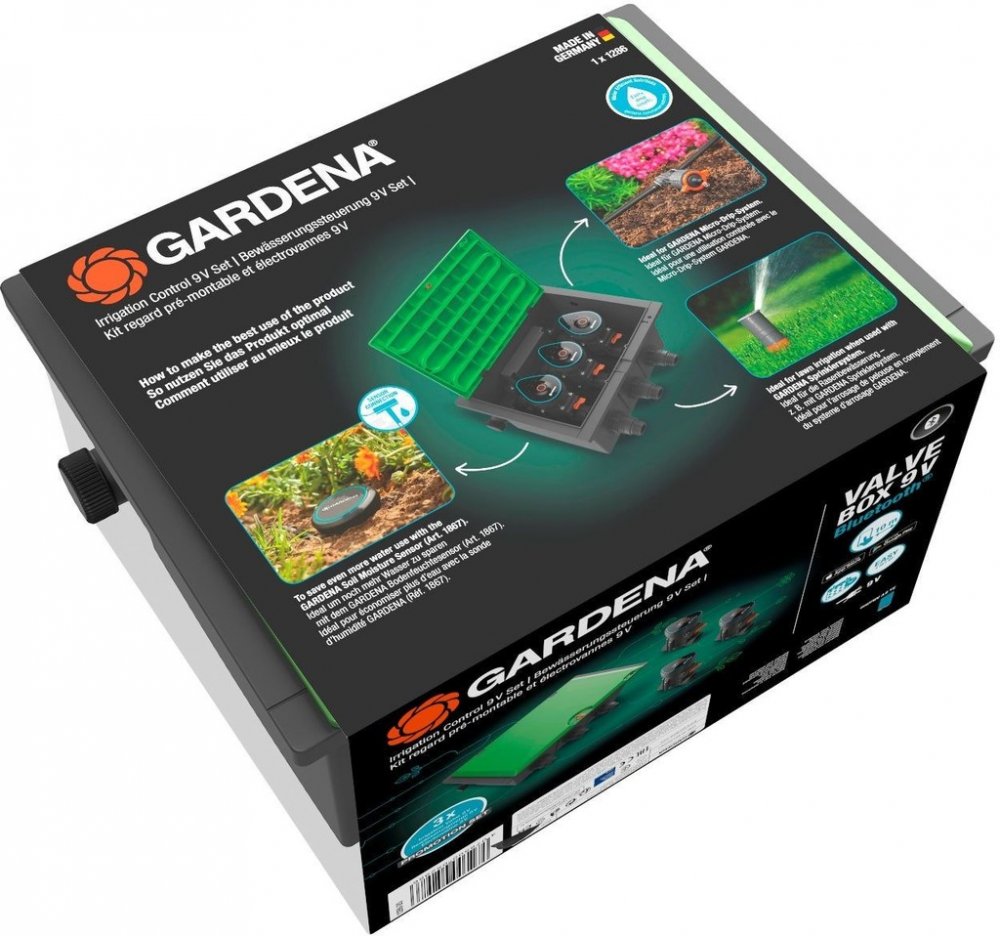 Zavlažovací ventil 9 V Bluetooth® značky GARDENA umožňuje zavlažování vaší zahrady automaticky, bezdrátově, a proto mimořádně pohodlně. Zavlažovací ventil 9 V Bluetooth® je prostě ideální, pokud chcete automaticky ovládat svůj zavlažovací systém Sprinklersystem na vaší zahradě, zejména v místech bez připojení k síti. Umožňuje umístění ventilů na různá místa v zahradě. Praktickým dálkovým ovládáním se stane váš tablet nebo chytrý telefon se systémem iOS nebo Android a bezplatnou aplikací GARDENA Bluetooth®. Pokud je například vaše zavlažování zahrady rozděleno do různých oblastí, můžete je nyní řídit a ovládat jednotlivě ze vzdálenosti do 10 metrů a bez připojení k síti nebo bez kabelů díky připojení přes Bluetooth®. Asistent plánování vám položí několik otázek a poté vám navrhne ideální kombinaci zavlažování. Svůj plán zavlažování si můžete přizpůsobit až šesti plány s rozdílným nastavením času zahájení, trvání zavlažování nebo konkrétních dnů v týdnu, kdy budou vaše rostliny zásobovány vodou. V případě potřeby můžete nastavit i dešťovou přestávku. Zajistíte si tak, že se vaše zahrada nebude během deštivého týdne zbytečně zavlažovat. Prospěje to vašim rostlinám a ušetří vodu. Ovládací prvek má dobře viditelné tlačítko, kterým můžete zavlažování ručně spustit nebo zastavit. Požadovanou dobu zavlažování lze nastavit v aplikaci GARDENA Bluetooth®. Kromě toho lze připojit samostatně prodejné čidlo půdní vlhkosti GARDENA pro zavlažování šetřící vodu podle potřeb. Zavlažovací ventil je opatřen 1" vnitřním závitem pro snadnou instalaci do samostatně prodejného boxu na ventily. Zavlažovací ventil 9 V Bluetooth® vyžaduje 9 V alkalickou baterii, která zajišťuje spolehlivý provoz po dobu alespoň jedné zahradnické sezóny; provoz je zcela bezdrátový a nezávislý na zdroji napájení. Konstrukce ventilu je optimalizována pro průtok vody s minimální ztrátou tlaku vody. Ovládací jednotka Bluetooth® nabízí praktické LED diody, které vás informují o připojení Bluetooth®, stavu baterie a aktuálním stavu zavlažování.