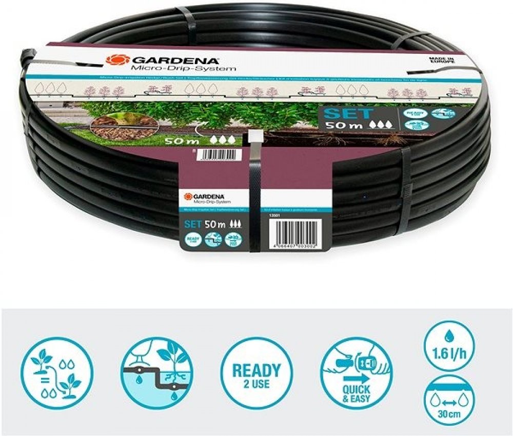 GARDENA Micro-Drip sada na zavlažování živých plotů/keřů (50 m) zajišťuje spolehlivé a vodu úsporné zavlažování vašich živých plotů, keřů, křovin nebo rostlin na předzahrádce