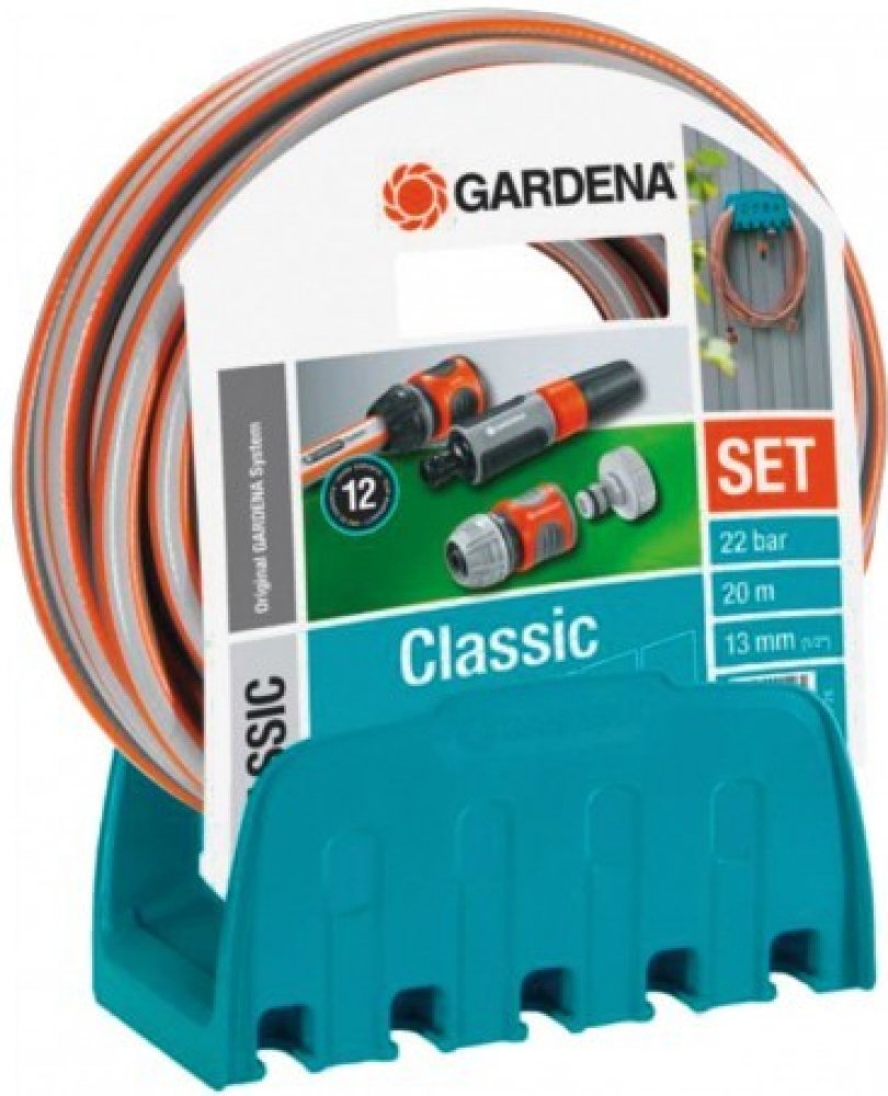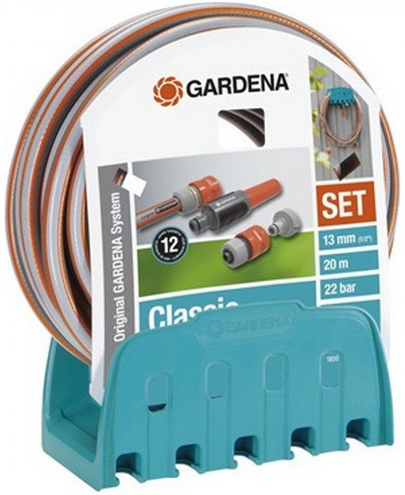 Souprava obsahuje nástěnný držák na hadici a 20 m hadici s přípojkou 13 mm (1/2"), všechny potřebné systémové díly a nastavitelný postřikovač. Hadice je odolná vůči tlaku až do 22 barů a udržuje si svůj tvar. Při skladování se hadice jednoduše omotá okolo držáku.