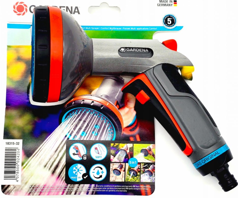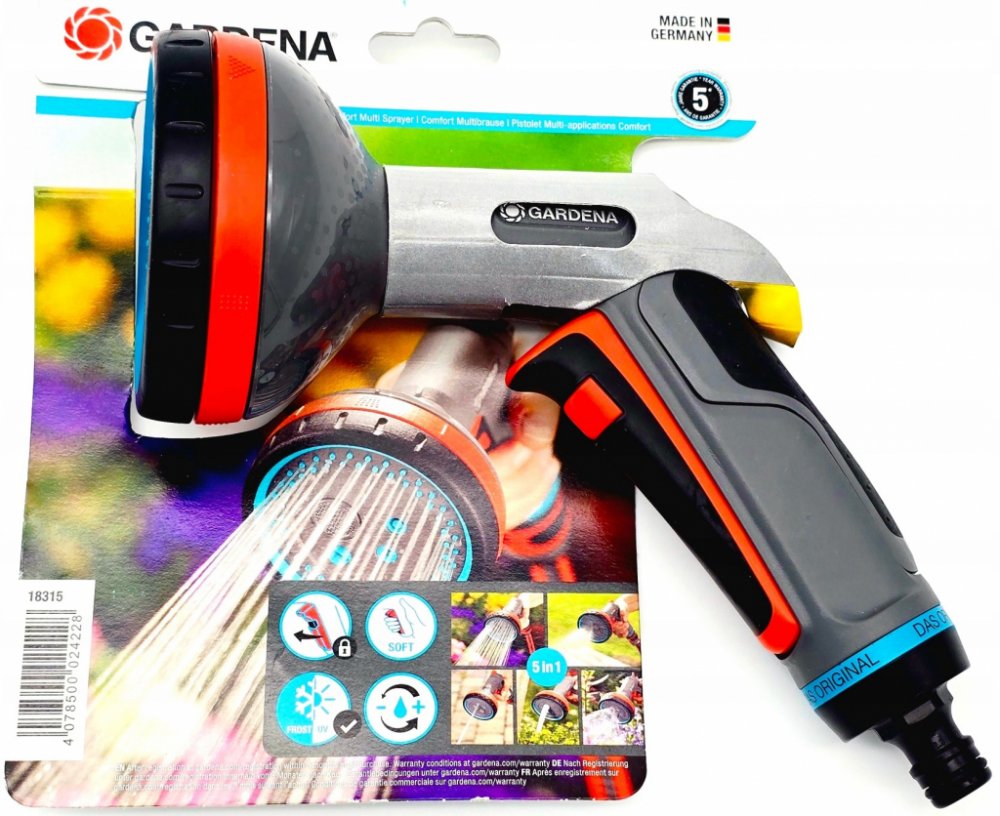 Multifunkční sprcha Comfort má pět různých zavlažovacích obrazců - od jemné mlhy přes šetrný rozprašovací a perličkový paprsek až po plný proud nebo plochý paprsek pro účinné čištění. Jemná mlha je vhodná pro zavlažování citlivých rostlin, šetrný paprsek pro přesné zavlažování záhonů a plný proud využijete při čištění.