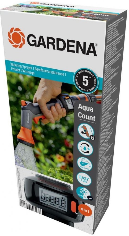 Nejen, že budete moci spolehlivě zavlažovat rostliny v květináčích nebo záhony pomocí zavlažovací sprchy AquaCount značky GARDENA, ale také budete mít vždy možnost sledovat vlastní spotřebu vody. Integrovaný průtokoměr vám nabízí spolehlivou podporu udržitelného zavlažování, a tím i úsporu vody. Vaše rostliny budou potěšeny jemným postřikem, můžete také regulovat intenzitu proudu vody na zadní straně sprchy. Ovládání je jednoduché a díky ergonomické rukojeti se zahradní sprcha pohodlně vejde do ruky. Zejména při delším zavlažování ulevíte vaší ruce tím, že využijete praktickou funkci blokování. Displej průtokoměru lze otáčet tak, aby byl stejně pohodlný pro leváky i praváky a díky 4 funkcím vám poskytne zajímavé informace. Funkce 1 a 2 ukazují celkovou spotřebu vody, např. za den a za sezónu. Funkce 3 ukazuje přesnou spotřebu vody na proces zavlažování a funkce 4 vám dává přehled o průtoku vody v litrech nebo galonech za minutu. Zavlažovací sprcha AquaCount je odolná vůči UV-záření a mrazu, a proto ji můžete nechat venku po celý rok. GARDENA poskytuje na tento výrobek z důvodu jeho vysoké kvality pětiletou záruku. AquaCount: zavlažování zahrad s odměřenou péčí.