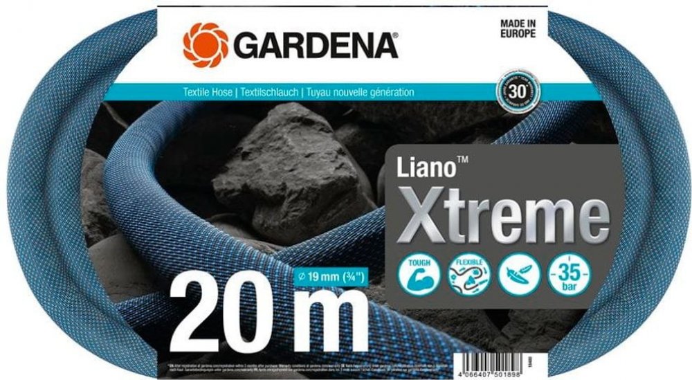 Hadice Gardena 18480-20 Textilní hadice Liano™ Xtreme 19 mm (3/4"), 20 m značky GARDENA je ideální hadice pro dlouhé, složité a náročné zavlažování středně velkých zahrad. Díky průměru 19 mm (3/4") nabízí hadice vysoký průtok vody a umožňuje rychle přepravit velké množství vody. Je tedy velmi vhodná například pro napájení velkých zavlažovačů nebo čerpadel. Díky předmontovaným dílům Original GARDENA System Liano™ rychlospojce a stopspojce Liano™ Water můžete hadici Liano™ Xtreme rychle používat. Liano™ Xtreme je navržena pro obzvláště náročné situace ve vaší zahradě a nekroutí se. Odolná hadice navíc odpuzuje nečistoty a můžete ji použít v nerovném terénu, například tam, kde jsou trnité růže, na dlažebních kostkách nebo podél zdí domu. Inovativní vnější hadice vyrobená z extrémně odolné textilie zajišťuje dlouhou životnost hadice, zatímco velmi pružná vnitřní hadice z PVC dodáv optimální výkon. Její výjimečná flexibilita vám pomůže ji použít mnohokrát a snadno s ní manévrovat po zemi, protože je méně pravděpodobné, že se díky své elasticitě zasekne o překážky.