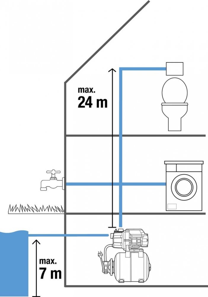 Transportuje vodu z nádrží, zásobníků s dešťovou vodou, studní a cisteren do domácnosti nebo zahrady.