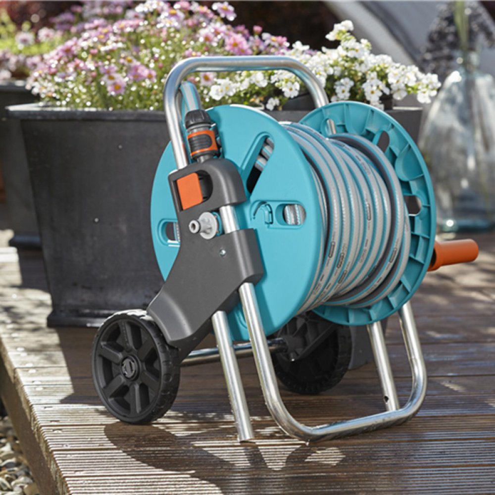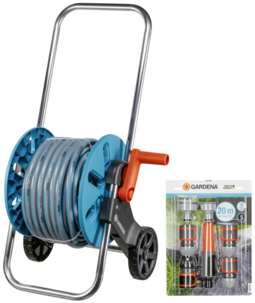 GARDENA vozík na hadici AquaRoll S umožňuje úsporné skladování zahradní hadice. Hadice se navíjí pomocí velké pevné kliky. Moderní ochrana proti mrazu a záruka v trvání 5 let jsou známkou kvality “Made in Germany”.