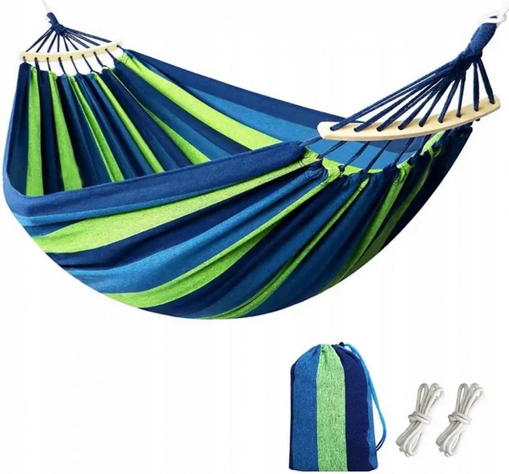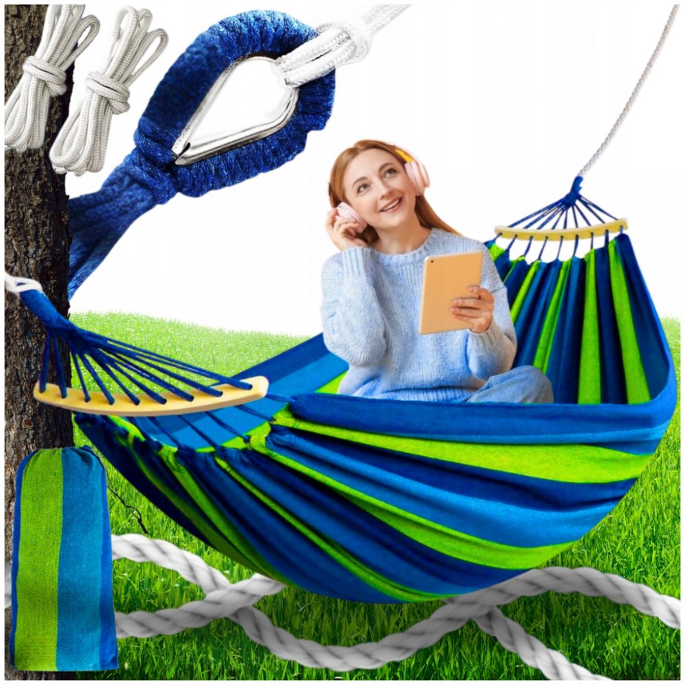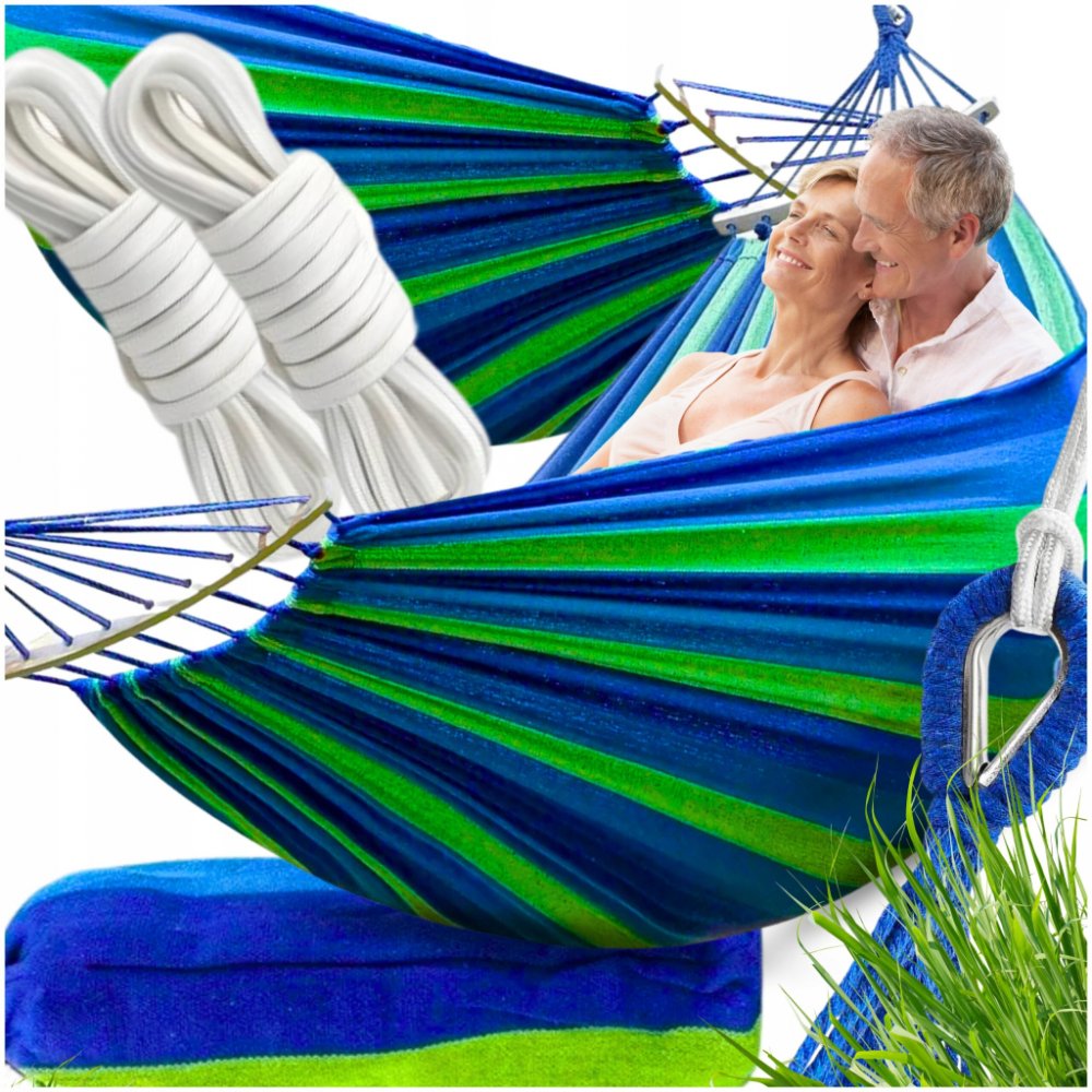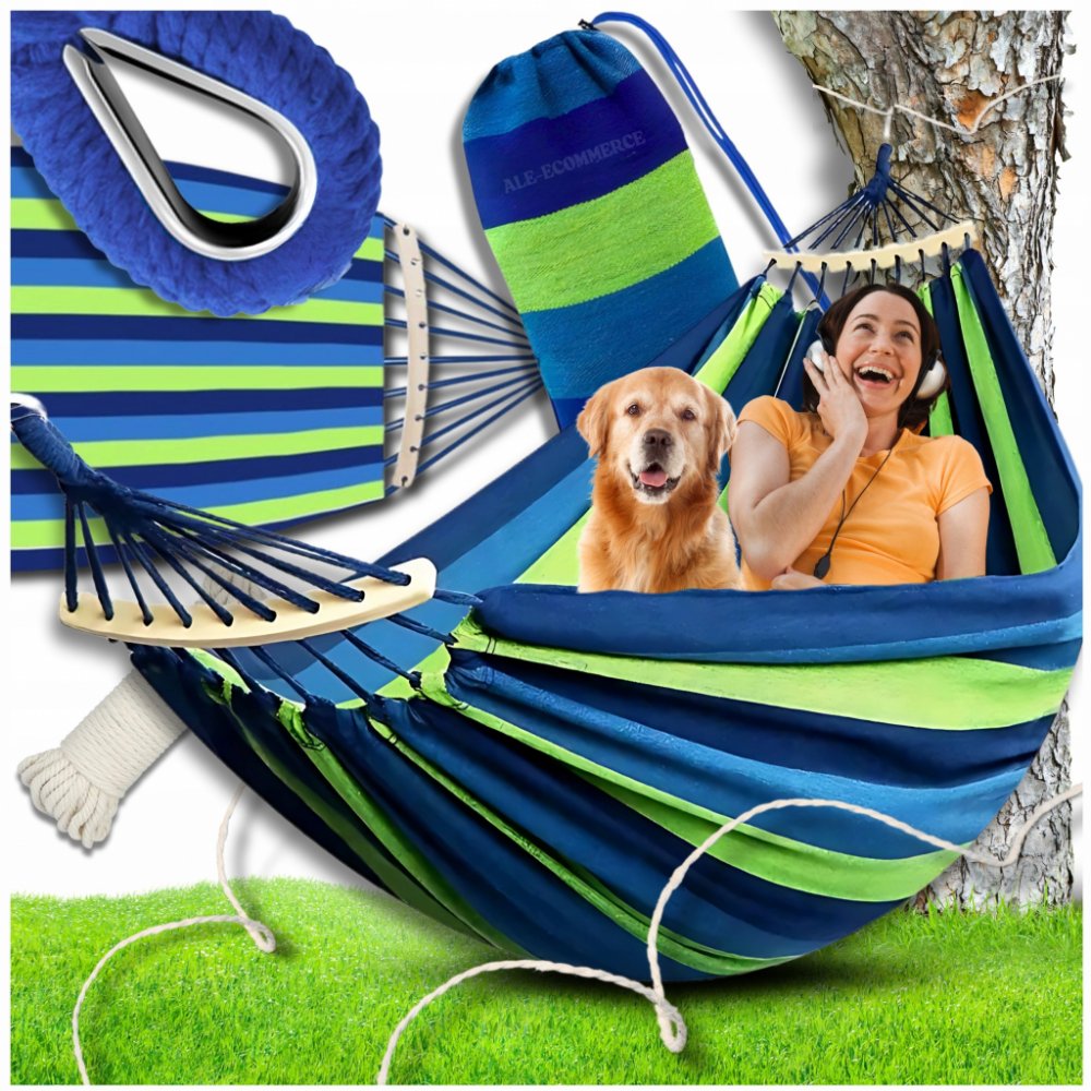 - SPECIFIKACE - barva: modrá/zelená; materiál: bavlna + polyester, ostatní: dřevo + nylon + potah: materiál: bavlna + polyester, ostatní: nylon; maximální zatížení: 150 kg; délka dřevěného rámu: 82 cm; rozměry materiálu (délka/šířka) 180x160cm; celkové rozměry (délka/šířka): 260x160cm; hmotnost: 1,788 kg, hmotnost balení: 1,804 kg.