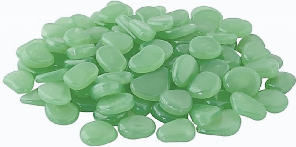 Svítící kameny jsou vyrobeny z fluorescenčního materiálu. Přes den jímá světlo, v noci svítí.