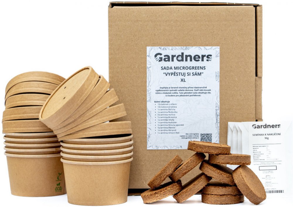 Co si vypěstujete Řeřicha má celkem ostrou a štiplavou chuť podobnou ředkvičkám. Obsahuje vitamíny A, B1, B2, B3, C, D a E a dále minerály železa, jódu, draslíku, vápníku a fosforu. Hodí se do salátů, na chleba nebo do tvarohu či pro zdobení pokrmů.Ředkvička má jemně štiplavou chuť a obsahuje velké množství bílkovin, vitamínů A, B1, B2, C, E a K. Je také bohatá na hořčík, železo, draslík, vápník, sodík, fosfor a zinek. Využijete ji do salátů, na chléb, do smoothie, pro bylinkový tvaroh, dipy nebo jako ozdobu vašich pokrmů.Hořčice se se svou poměrně ostrou chutí hodí k velké škále pokrmů. Obsahuje vitamíny A, B1, B2, C, E, K a minerály železa, draslíku, vápníku, hořčíku, fosforu, síry a zinku. Obsahuje také hořčičný olej. Hodí se do salátů, na tvaroh s bylinkami či jako ozdoba vašich pokrmů. Brokolice obsahuje vitamín C, vitamíny skupiny B, provitamín A, minerály a především sirné sloučeniny (sulforafan). Organická síra je (podobně jako v cibuli) velmi důležitá pro správné fungování imunitního systému a je účinným antioxidačním prostředkem, který blokuje rakovinné bujení. Drobné klíčky brokolice obsahují mnohonásobné množství živin, než v samotném plodu, proto jich stačí ke konzumaci jen malá hrst denně. A právě vyklíčená semínka brokolice mohou významně posílit organismus hlavně v chladném období roku a chránit jej proti různým infekčním chorobám.Alfalfa neboli vojtěška. Pojem vojtěška znamená „otec všeho jídla“. Má lehce oříškovou chuť, vysoký obsah bílkovin a chlorofylu. Obsahuje všech 8 esenciálních aminokyselin, vápník a vitamíny.Mizuna je asijská listová zelenina, původem z Japonska. Chuť této zeleniny je jemně pikantní. Výborně se mizuna hodí do čerstvých salátů nebo ji lze zpracovávat podobně jako špenát. V čerstvých pokrmech také působí velmi dekorativně. Mizuna je bohatá na karotenoidy a další vitamíny. Z minerálních látek obsahuje draslík, vápník nebo hořčík.Kedlubna červená má svěží, jemnou chuť, která lehce připomíná zelí. Má vysoký obsah vitamínů A, B1, B2, B3, C, železa, draslíku, vápníku, hořčíku, síry a zinku. Hodí se do salátů, na chléb, k odšťavňování, do smoothie, jako bylinkový tvaroh, s ovocem nebo jako ozdoba vašich pokrmů.Koriandr je aromatická bylina z jihovýchodní Asie a severní Afriky. Je základní složkou mnoha světových kuchyní, kde se její listy nebo semena běžně používají k dochucení většiny pokrmů. Chuť prvních lístků po naklíčení je intenzivní. Stačí tedy k dochucení malé množství. Koriandr je výborný proti chlesterolu, protože má vysoký obsah omega 3 mastných kyselin. Podporuje naší obranyschopnost, trávení, reguluje krevní tlak a působí jako přírodní antibiotikum.Amarant Red neboli Červený amaranth jsou velice drobná, perleťově černá nebo bílá semínka. Pěstuje se snadno a rychle klíčí. Výhonky obsahují jako ostatní microgreens mnoho vitamínů a minerálů, např. vápník, železo, draslík, fosfor, vitamín A a C. Obecně výhonky amaranthu pomáhají detoxikovat organismus, předcházet stárnutí, snižují krevní tlak a cholesterol a chrání kardiovaskulární zdraví. Výhonky obsahují betaniny. Červený amaranth má spíše zemitou chuť, není výrazný chuťově ale nahrazuje to plně vzhledem. Hodí se k dozdobení mnoha jídel. Amaranth pomáhá k regeneraci svalů. Pšenice je celosvětově základní potravinářská plodina. Pšeničná zrna jsou bohatým zdrojem sacharidů, minerálů, bílkovin, vitamínů, vlákniny a různých fytochemikálií, které podporují zdraví. Pěstování výhonků zvyšuje pak antioxidační potenciál pšenice. 6-10denní výhonky se pak nazývají "pšeničná tráva". Obsahuje vitamíny A,B,C a E a minerály vápník, hořčík, zinek, měď. Pšenice je velký zdroj chlorofylu. Balení obsahuje 10x kelímek10x kokosová tableta1x alfalfa 10g1x hořčice bílá 10g1x řeřicha 10g1x ředkvička růžová 10g1x mizuna japonská 10g1x kedlubna červená 10g1x brokolice 10g1x pšenice 10g1x amarant red 10g1x koriandr 10g1x dárková krabice1x návod(V případě potřeby si vyhrazujeme právo mírně upravit druhy semínek podle aktuální skladové dostupnosti. Sáčky se semínky si připravujeme sami, snažíme se mít vždy přesně 10 g, přípustná odchylka může být ale 0,5 g = 5%. Děkujeme za pochopení.)Vitamíny vždy po ruce! Tato jednoduchá sada pro klíčení a pěstování microgreens vám to umožní. Dopřejte si čerstvé vitamíny přímo vlastnoručně vypěstované v pohodlí vašeho domova. Stačí vám kousek místa třeba na parapetu, dostatek světla a udržovat vlhkost. Tato pěstební sada obsahuje vše, co budete pro pěstování potřebovat a návod jak postupovat. O Microgreens si můžete přečíst také náš článek, kde jsme vše podrobně vysvětlili.Naše sada vám vystačí dokonce nadvakrát! Kokosová tableta jde totiž použít z obou stran a pytlíček se semínky bohatě vystačí na dvě vysetí. Takže až sklidíte první úrodu, tabletu z kokosového vlákna v kelímku obraťte, znovu nasypte semínka a vypěstujte druhou úrodu! Kokosové tablety jsou lisované ze 100% kokosového substrátu. Nejen, že jsou tablety praktické pro předpěstování rostlin, nebo pro pěstování rostlin z řízků, jsou také ideální na klíčení microgreens. Vytvoří pro semínka vhodné prostředí, udržují správnou vlhkost a jsou 100 přírodní. Kokosové tablety stačí zalít vlažnou vodou (cca 180 ml) a nechat je několik minut nabobtnat. S láskou připraveno, vlastnoručně testováno - přímo od Gardners. Mít doma vlastní naklíčené microgreens je hračka! Koukněte na naše youtube video.