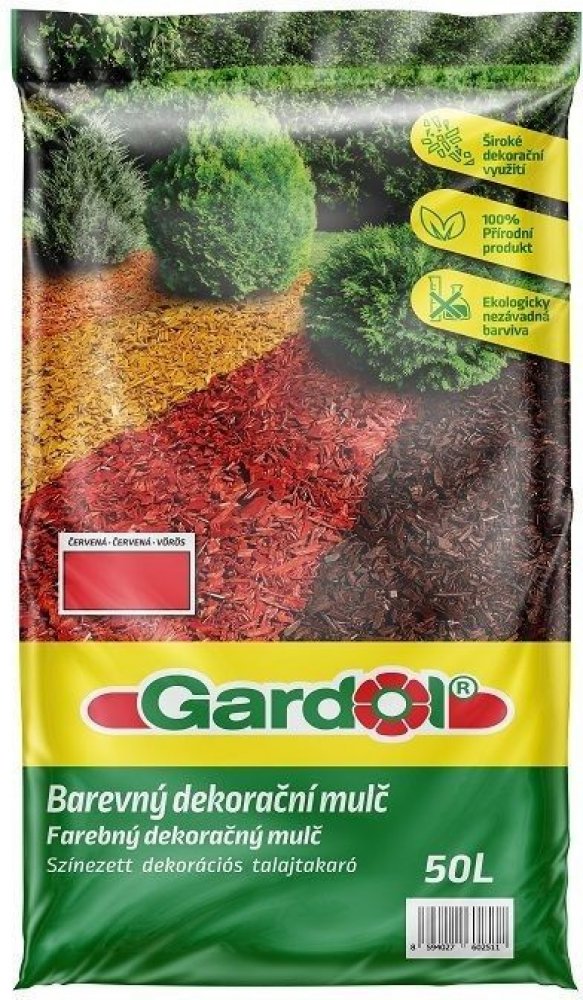 Červený dekorační mulč od značky Gardol je vyroben z kvalitních přírodních materiálů a používá se k dekorativnímu zakrytí půdy. Mulčovací kůra je barvena ekologickými barvami na bázi oxidu železa a je nezávadná i pro citlivější rostliny. Dlouhodobě odolává povětrnostním vlivům, zabraňuje rašení plevele a omezuje odpařování vody z půdy, čímž snižuje frekvenci zavlažování.