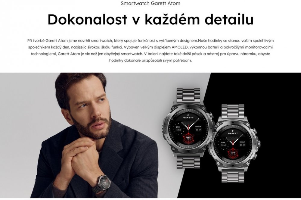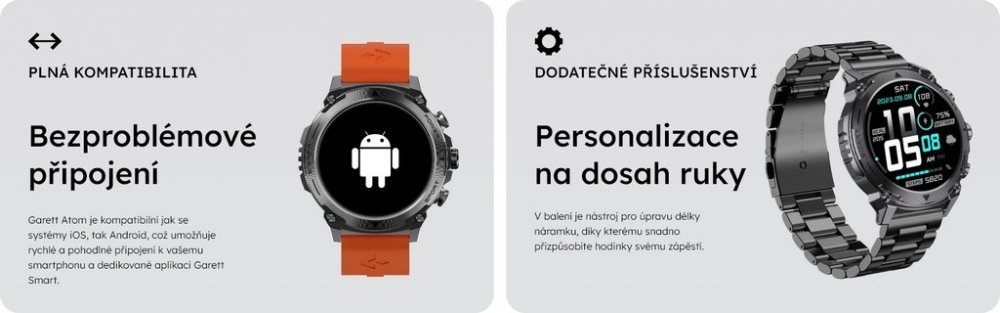 Při navrhování modelu Garett Atom jsme vytvořili chytré hodinky, které nabízejí řadu doplňkových funkcí. Spojili jsme plnou funkčnost s unikátním, elegantním designem, aby se naše hodinky staly vaším ideálním společníkem na každý den. Velký AMOLED displej, odolná baterie a pokročilé monitorovací funkce jsou jen zlomkem jeho možností. V balení najdete pásek navíc a zařízení na zkrácení náramku, díky kterému si hodinky dokonale přizpůsobíte svým potřebám.