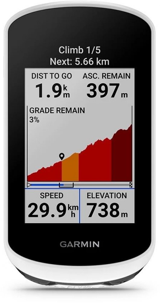 Automaticky se zobrazuje zbývající stoupání a sklon při zdolávání kopců na trase. Pomůže vám to si líp rozložit síly a budete vědět, za jak dlouho dojedete na vrchol. V zařízení nebo v aplikaci Garmin Connect si pak můžete stoupání uložit a po jízdě ho vyhodnotit.