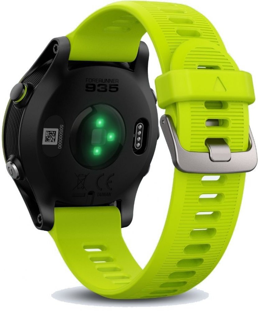 • Forerunner® 935 je vybavený vstavaným optickým snímačom pulzu. Táto technológia využíva zelené svetlo doplnené o fotodiódy - citlivé na úbytok rozptýleného svetla, ktoré preniká do pokožky. Prietok krvi (pulz) je sprevádzaný absorbovaním zeleného svetla a tento úbytok zaznamenávajú fotodiódy. Výsledkom je relatívne presné meranie pulzu, ktoré má svoje limity a na rozdiel od bežného snímača (hrudný pás) nedokáže zaznamenávať variabilitu srdcovej frekvencie.