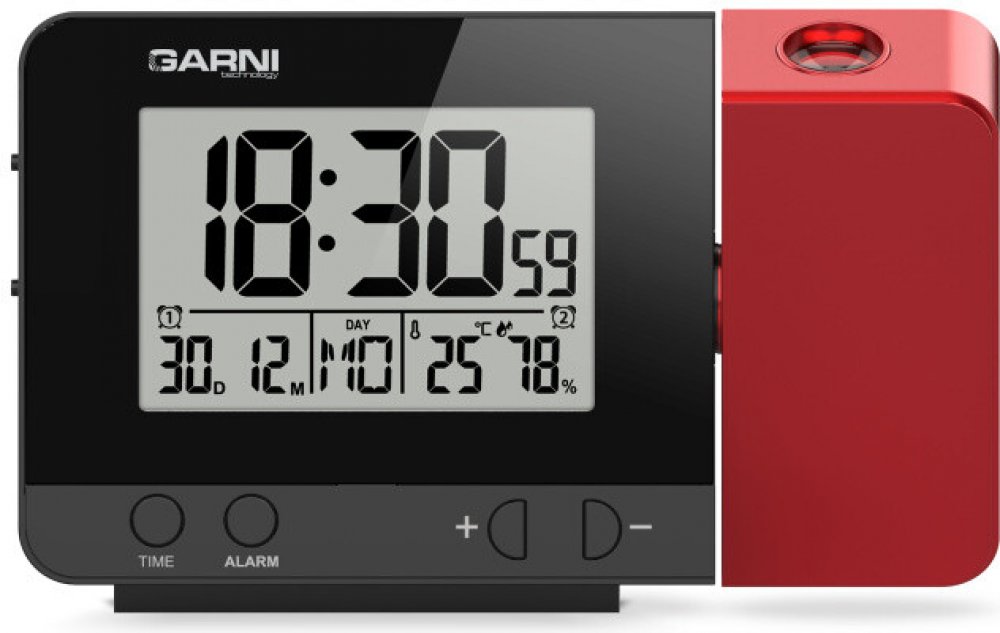 Digitální budík s projekcí času a vnitřní teploty s LCD displejem, časem řízeným rádiovým signálem DCF-77 a měřením vnitřní teploty a relativní vlhkosti