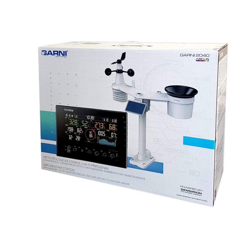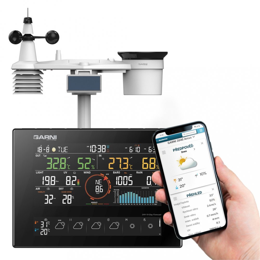 Meteorologická stanice s Wi-Fi, 24hodinovou (předpověď po hodině) / 10denní předpovědí a profesionálním integrovaným bezdrátovým čidlem 7-v-1, model GARNI 2040 Arcus, shromažďuje přesné a podrobné údaje o počasí, které následně v reálném čase nahrává pomocí vestavěného modulu Wi-Fi a místní Wi-Fi sítě na meteorologický server ProWeatherLive. Ten umožňuje automatizované nahrávání údajů z meteorologické stanice a volný přístup ke všem údajům odkudkoliv, kde je přístup k internetu, a to prostřednictvím webového prohlížeče nebo mobilní aplikace. Současně server PWL odesílá do hlavní jednotky informace o dohlednosti, oblačnosti a 24hodinové / 10denní předpovědi počasí. Výrobek nabízí solidní výkon všem profesionálním pozorovatelům a nadšencům, a to díky široké škále nastavení a čidel. Stanice vám poskytne místní předpověď, maximální a minimální hodnoty a celkové hodnoty všech meteorologických veličin, to vše, aniž byste museli použít stolní počítač.