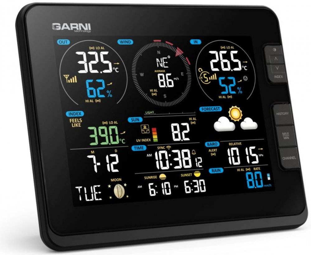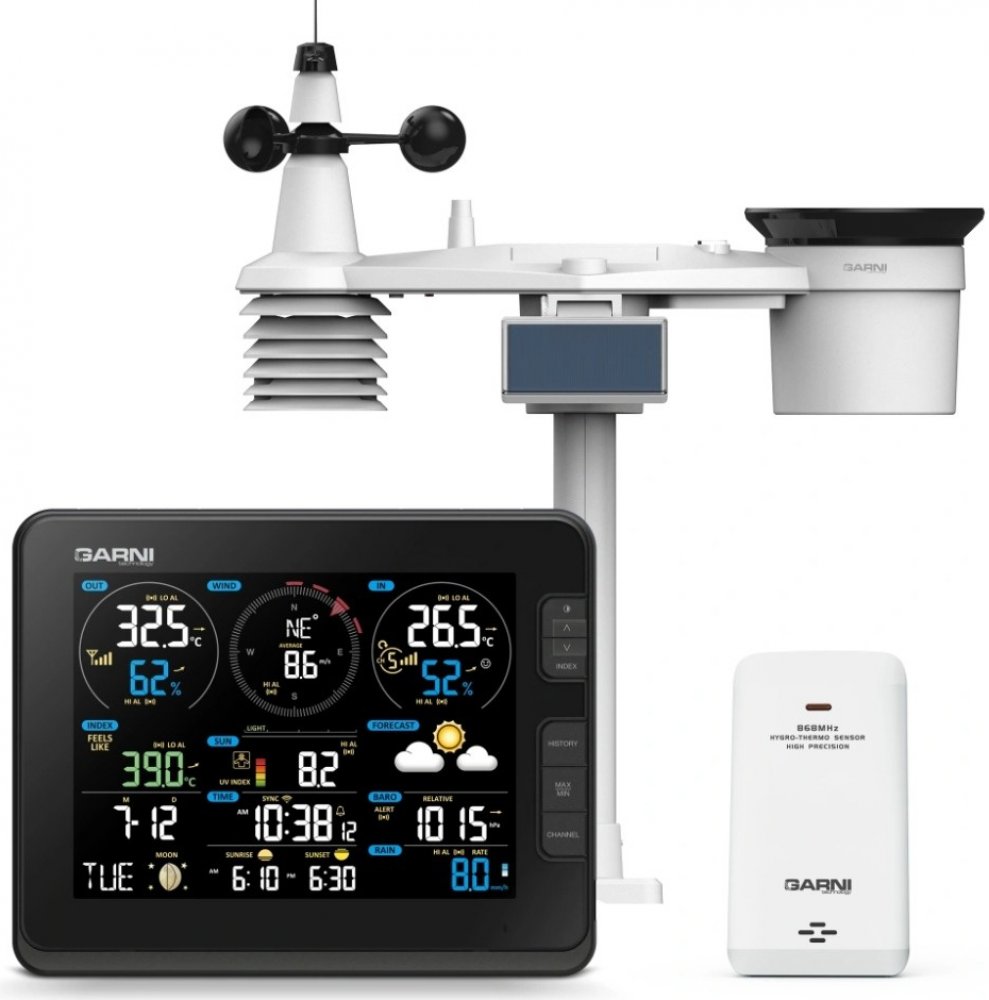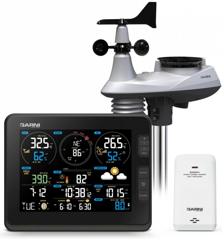 Poloprofesionální Wi-Fi meteorologická stanice model GARNI 2055 Arcus s integrovaným bezdrátovým čidlem 7-v-1 s vestavěným ventilátorem, která je vybavena mnoha funkcemi shromažďuje přesné a podrobné údaje o počasí. Integrované bezdrátové čidlo pracuje na frekvenci 868 MHz a měří vnitřní/vnější teplotu a relativní vlhkost, rychlost a směr větru, dešťové srážky, barometrický tlak, UV index a intenz...