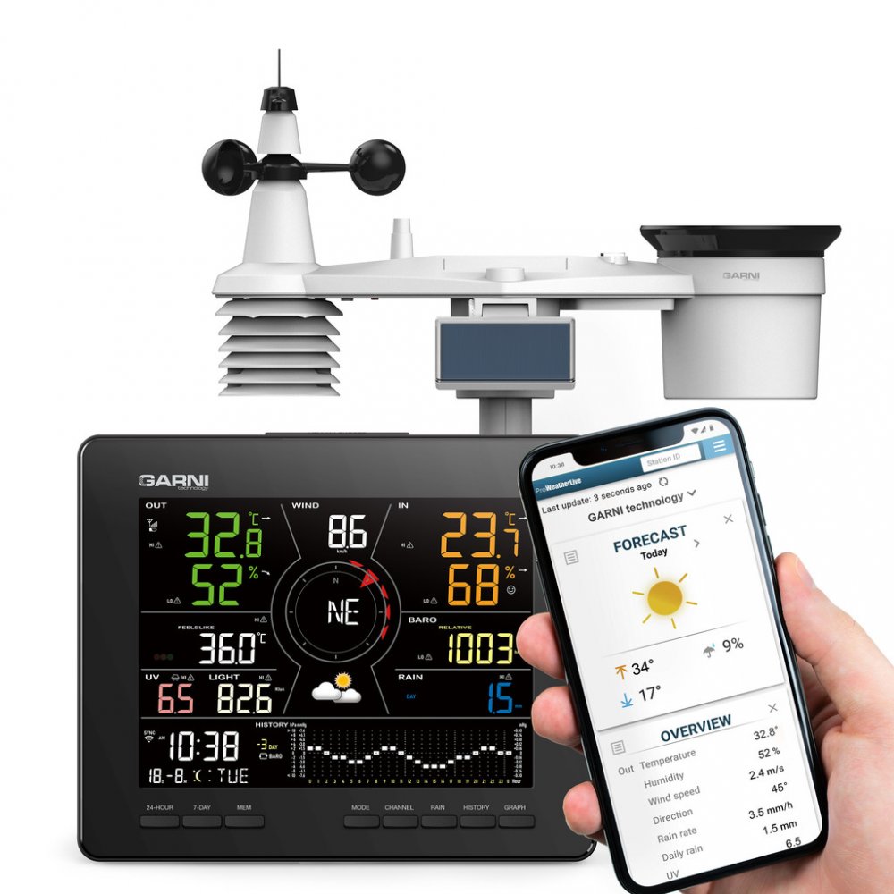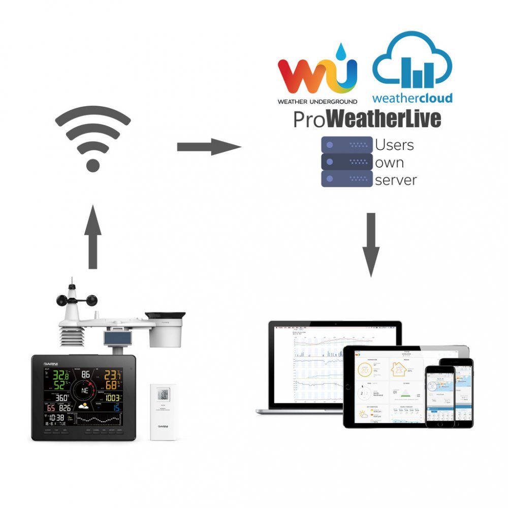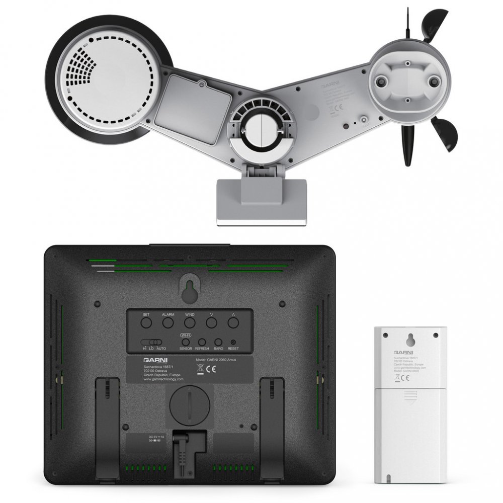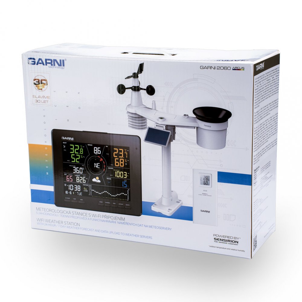 Meteorologická stanice s Wi-Fi, 24hodinovou / 7denní předpovědí a profesionálním integrovaným bezdrátovým čidlem 7-v-1 se solárním panelem a vestavěným kapacitorem, model GARNI 2060 Arcus, shromažďuje přesné a podrobné údaje o počasí, které jsou pak v reálném čase odesílány pomocí vestavěného Wi-Fi modulu a místní sítě Wi-Fi na meteorologické servery, jako je ProWeatherLive, Weather Underground, Weathercloud nebo vlastní server uživatele (doporučeno pouze pro zkušené uživatele).