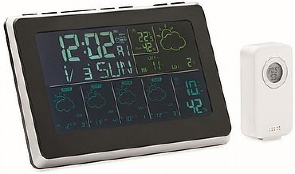 - barvy na displeji – čas, datum, zkratka názvu dne bílá, vnitřní teplota a rel. vlhkost oranžová, vnější teplota a rel vlhkost zelená