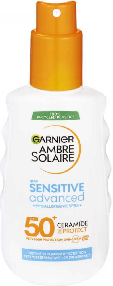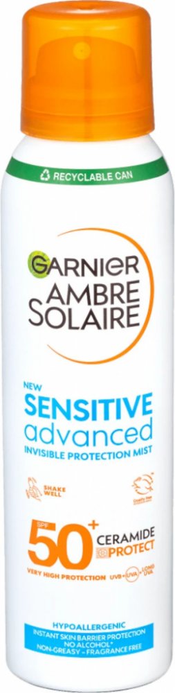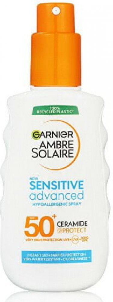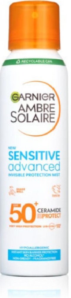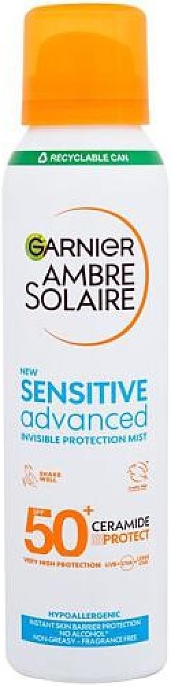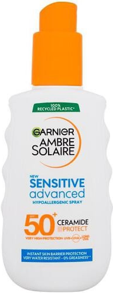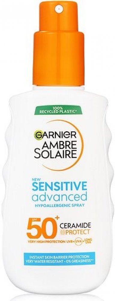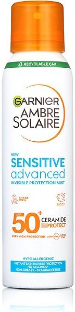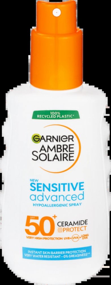 GARNIER AMBRE SOLAIRE opalovací péče ve spreji Sensitive Advanced s ceramidy spolehlivě chrání citlivou pokožku proti UVA a UVB záření a poskytuje okamžitou ochranu bariérové funkce pokožky. Navíc se rychle vstřebává a je voděodolný. Složení je bez parfemace a bylo testováno pod dermatologickou kontrolou. Ochranný sprej Sensitive Advanced od značky GARNIER AMBRE SOLAIRE je vhodná na tělo i obličej...