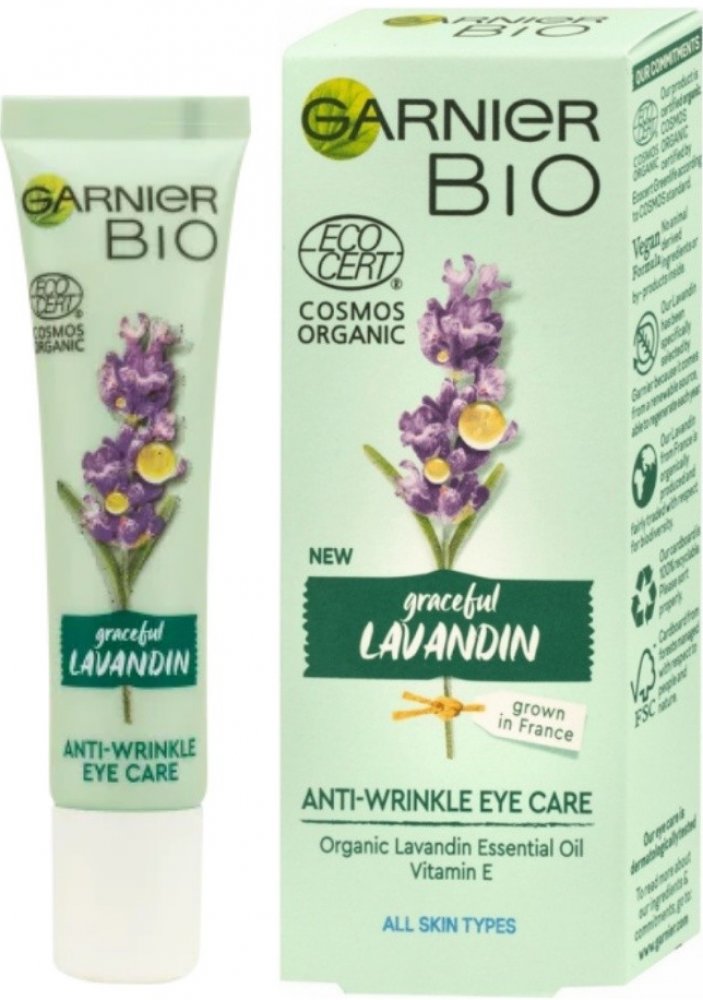 oční krém proti stárnutí pleti Graceful Lavandin od Garnier Bio s organickým éterickým levandulovým olejem, vitaminem E, Aloe vera, arganový olej či kandelilový voskem s levandulovým olejem z Francie dodává pokožce okolo očí jemnost a zářivost s certifikátem EcoCert, 36% složek pochází z ekologického zemědělství Objevte novou řadu přírodní kosmetiky Garnier BIO! Oční krém proti vráskám Graceful Lavandin s organickým levandulovým a extraktem z Aloe vera viditelně pleť vyživuje, zjemňuje a udržuje ji rozzářenou a zvlhčenou. Přírodní složení obohacené o organický arganový olej dodává pokožce zářivější vzhled. Oční krém proti stárnutí Graceful Lavandin od Garnier BIO vás potěší svěží vůní a zajistí dokonalý pocit jemné pleti po celý den.