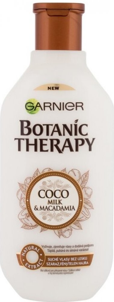 - šampon Botanic Therapy obohacený o výtažky z vyživujícího kokosového mléka a makadamiového oleje pečuje o suché a hrubé vlasy. Dodává jim sílu, jemnost a lesk