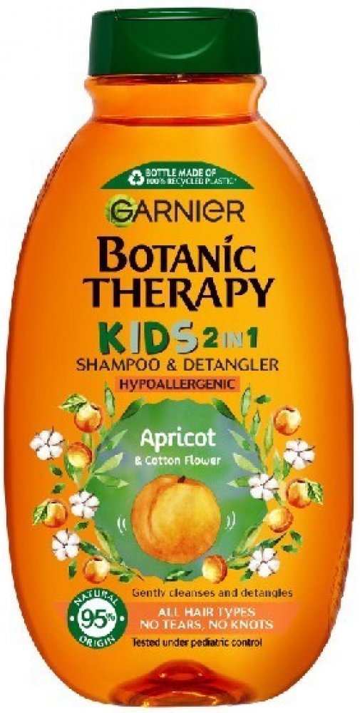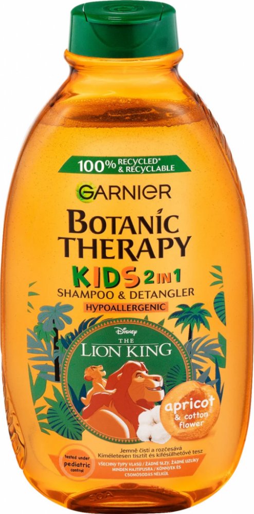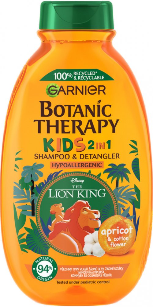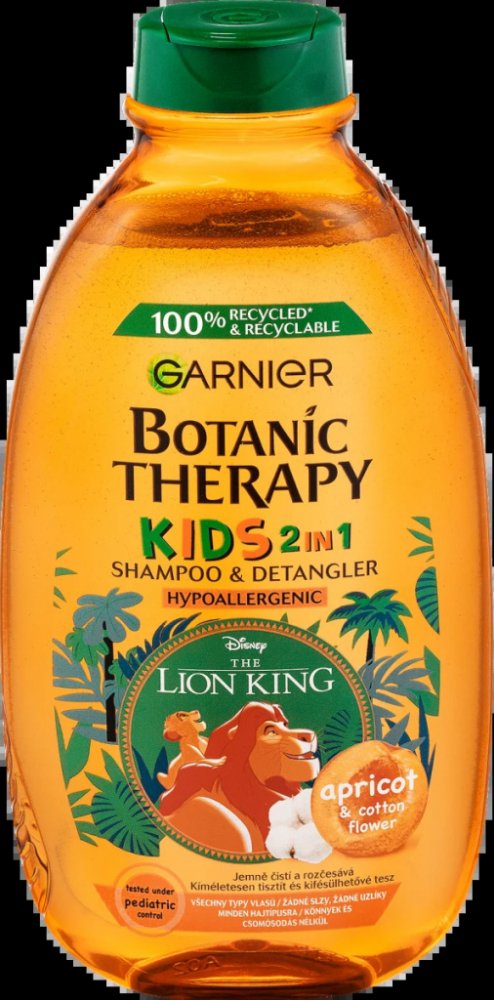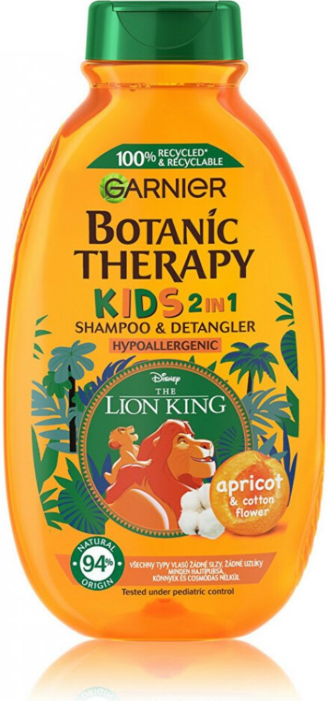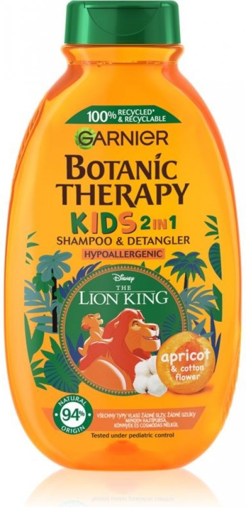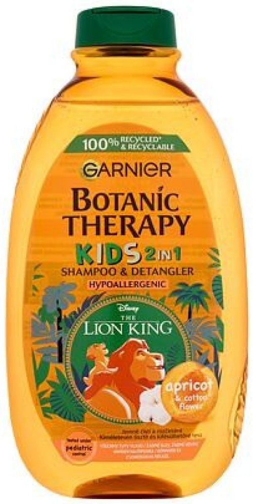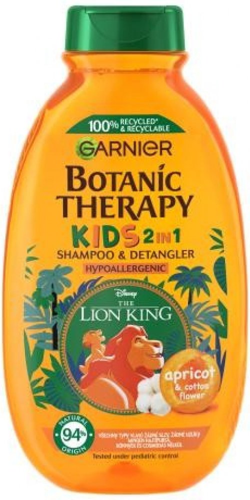 Objevte jemný dětský šampon Garnier Botanic Therapy Kids Lion King Shampoo amp; Detangler, který šetrně smývá nečistoty a neštípe v očích. Zanechává vlásky snadno upravitelné, bez zacuchání, provoněné meruňkami a květem bavlníku. Proč si vaše děti oblíbí Botanic Therapy Kids Lion King 2in1? plní funkci šamponu i kondicionéru, atraktivní obal s oblíbeným kresleným hrdinou Lví král, zanechává vlasy bez zacuchání, usnadňuje jejich rozčesávání, dodává jim lesk a hydrataci, neštípe v očích, jemná ovocná vůně meruňky a květu bavlníku, oftalmologicky a pediatricky testován, hypoalergenní složení, bez obsahu parabenů, vhodný pro děti od 3 let. Správné používání dětského šamponu: Naneste šampon do mokrých vlasů a vytvořte pěnu. Poté důkladně opláchněte vodou.