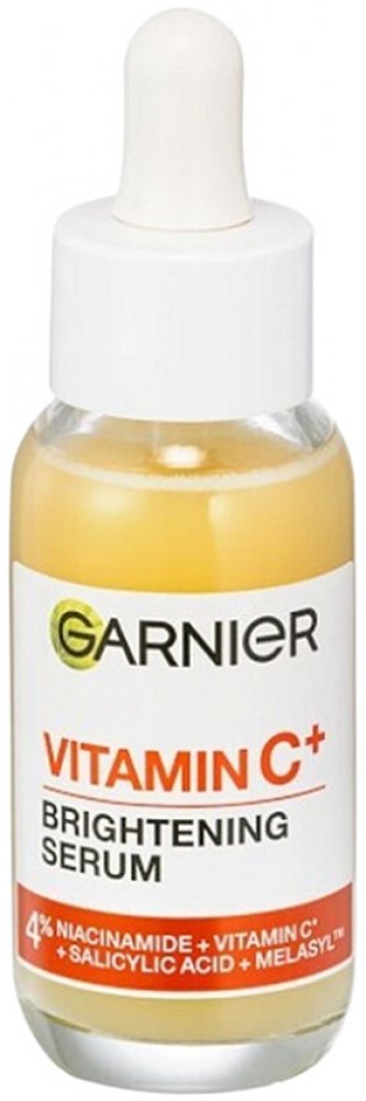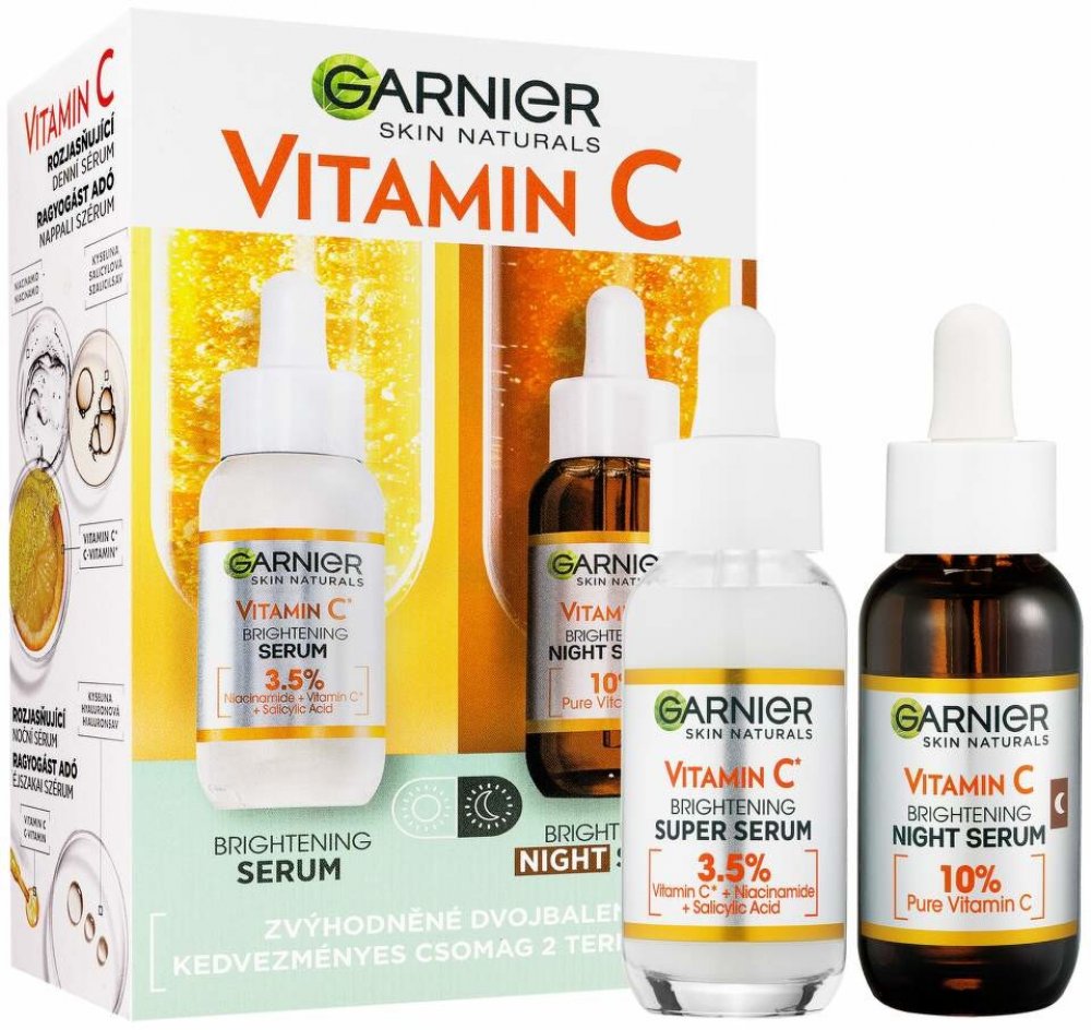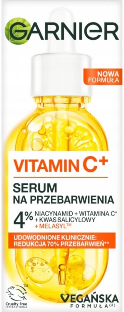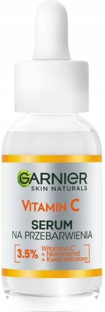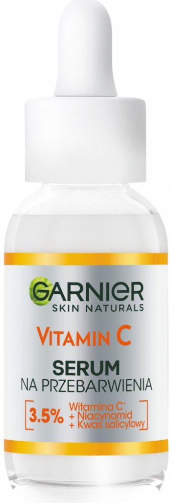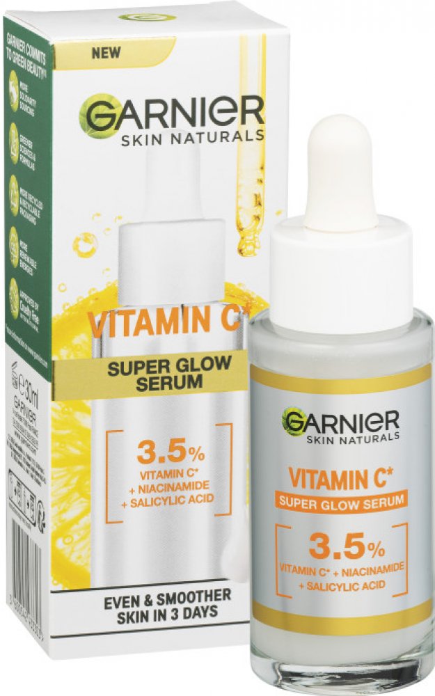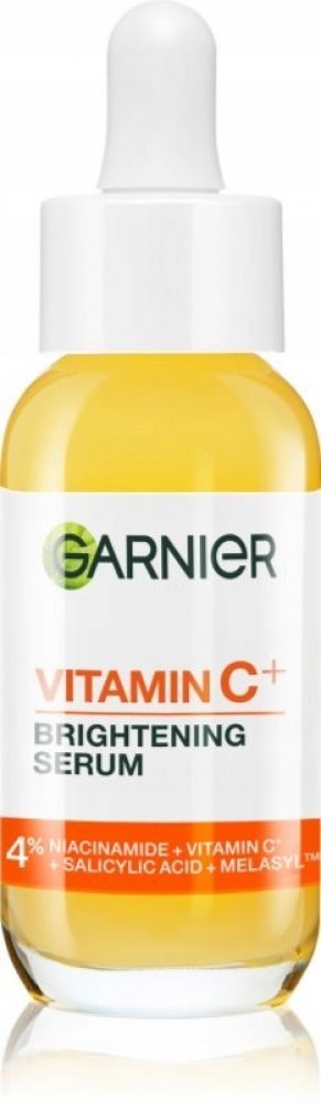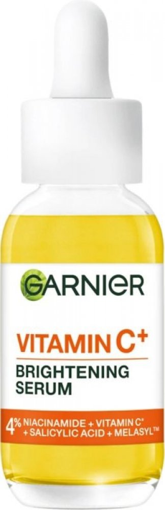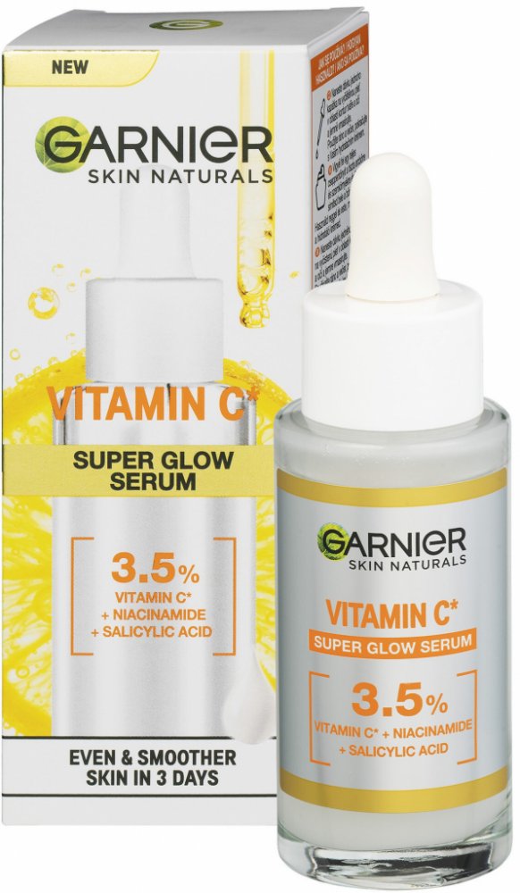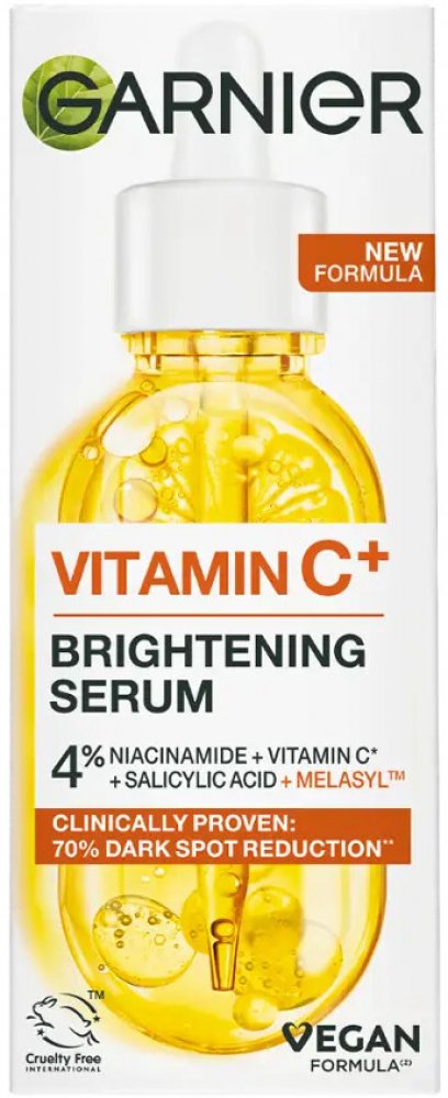 První sérum od Garnier s 3,5 % komplexu látek s intenzivním efektem na pokožku (vitamin C, niacinamid, a kyselina salicylová) pro snížení viditelnosti pigmentových skvrn již za 6 dní a podporu tvorby kolagenu pro hladší pleť.