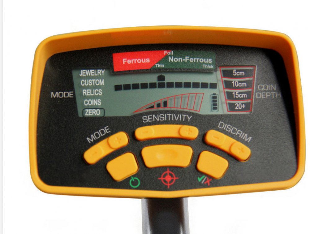 Na displeji je zobrazen 5stupňový graf vodivosti předmětu, zvolený mód a přibližná hloubka detekovaného předmětu.