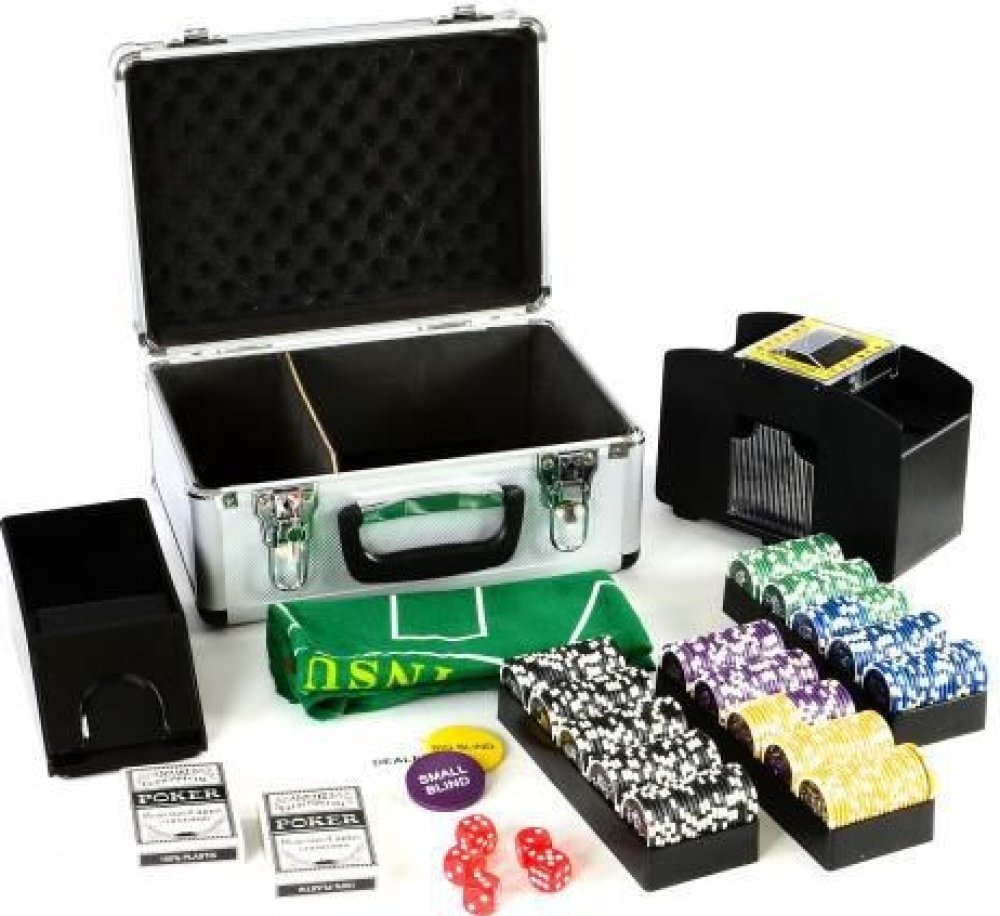 - žetony: 50 x zelený hodnota 25, 50 x světle modrý hodnota 50, 100 x černý hodnota 100, 50 x fialový hodnota 500, 50 x žluté hodnota 1000