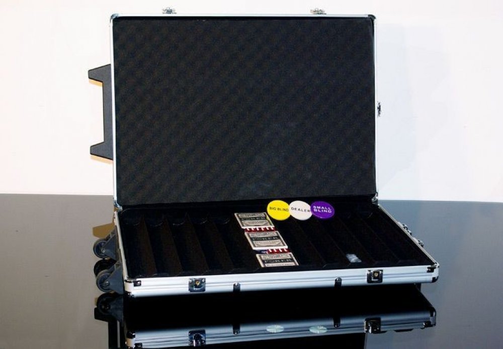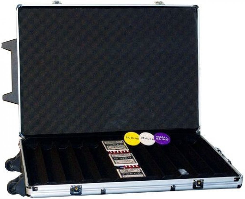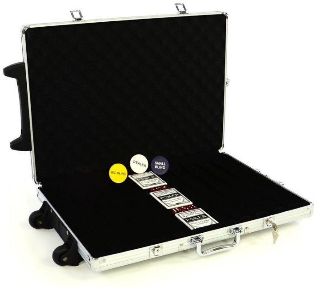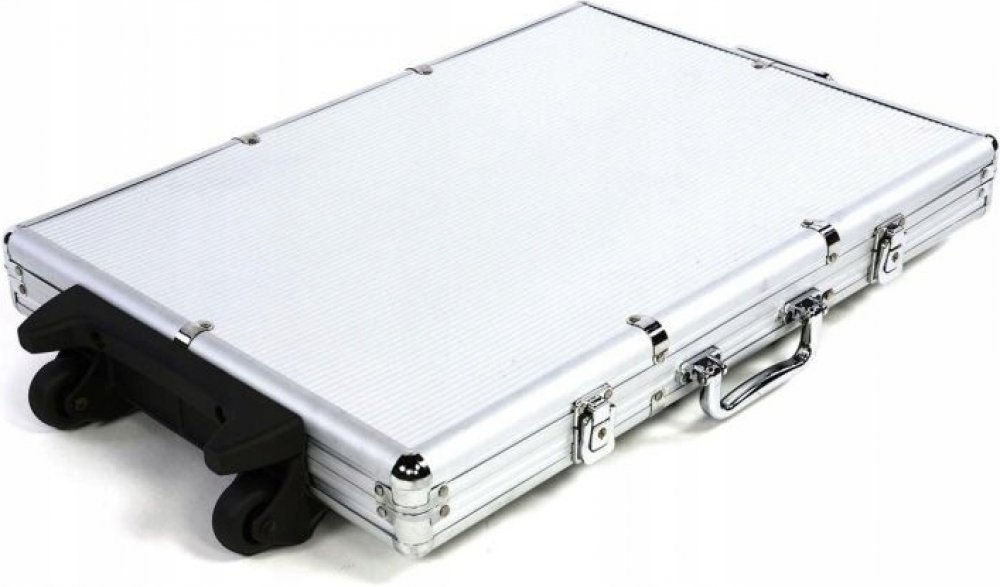 Hliníkový kufr na 1000 ks žetonů s příslušenstvím Trolley Robusní hliníkový kufr na kolečkách se třemi zámky a výsuvnou rukojetí je ideální až pro 1000 pokerových žetonů. Je třeba dokoupit žetony, které si můžete individuálně vybrat, zbytek vybavení je kompletní.