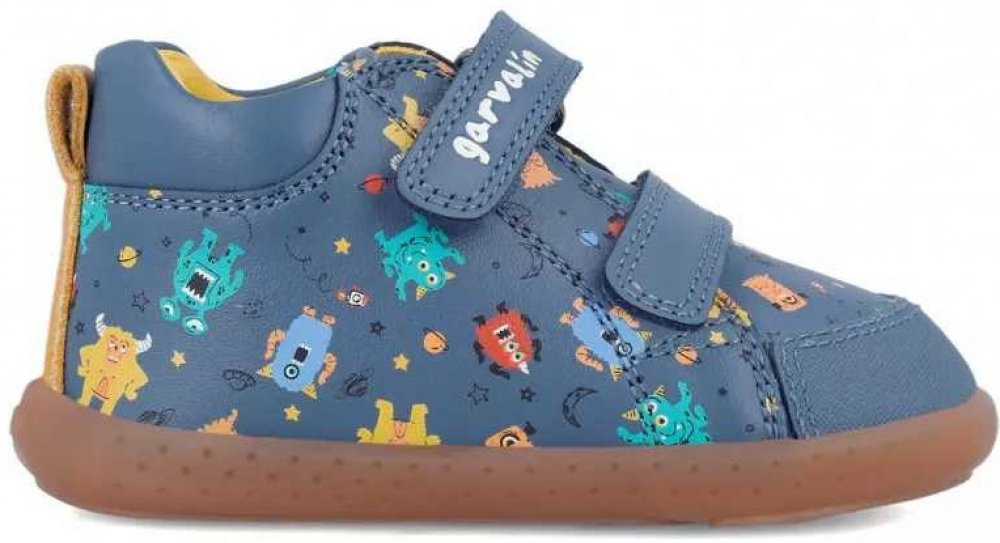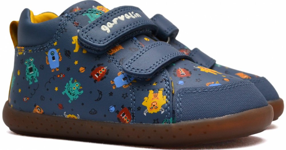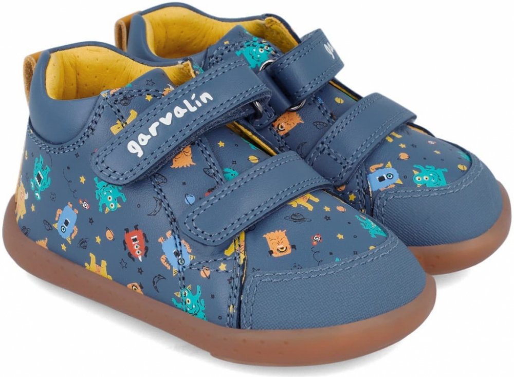 Garvalín 241308-A556 Petrol jsou dětské kožené barefoot boty v modré barvě s oblíbeným motivem příšerek. Středně vysoké provedení vhodné na podzim, končí na kotníku. Jsou z hladké dobře omyvatelné kůže v modré barvě s potiskem, s podrážkou z přírodní gumy. Vnitřek je z mikrovlákna, které působí jako kůže, a je velmi příjemné na omak, s vyjímatelnou koženou stélkou. Na špičce boty je ochranná synte...