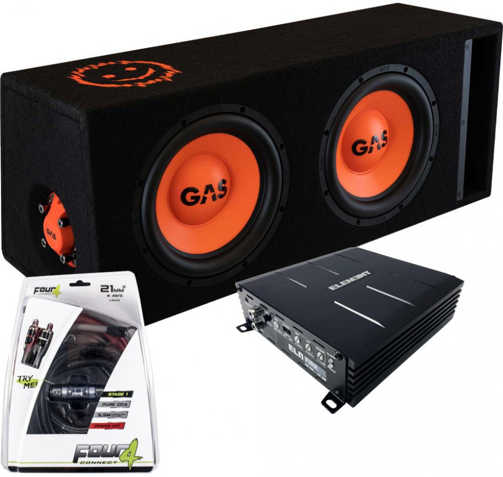 GAS MAD B2-210 + u-Dimension ELA FIRE + kabelová sada Four Connect je sada duálního 10" (250 mm) subwooferu v bassreflexovém boxu s 1-kanálovým digitálním zesilovačem a napájecí sadou o průřezu 20 qmm.