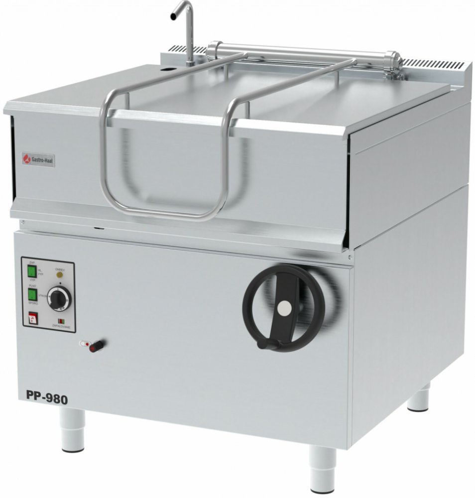 Varnou nádobu lze jednoduše zakrýt poklopem a obsah (uvařený pokrm, olej nebo vodu) umíme vyklopit pomocí otočného kola , se kterým se manipuluje jednoduše.