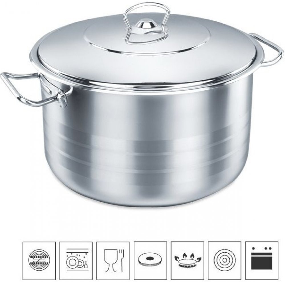 nerezový, vhodný na plynovou, elektrickou a sklokeramickou varnou desku, kulatý tvar, objem 10 l, nerezová rukojeť, možnost použití neostrého kovového náčiní, použití v troubě a možnost mytí v myčce, rozměry 17 × 37 cm (V×D), průměr 28 cm, poklice v balení, stříbrná barva (A1942)