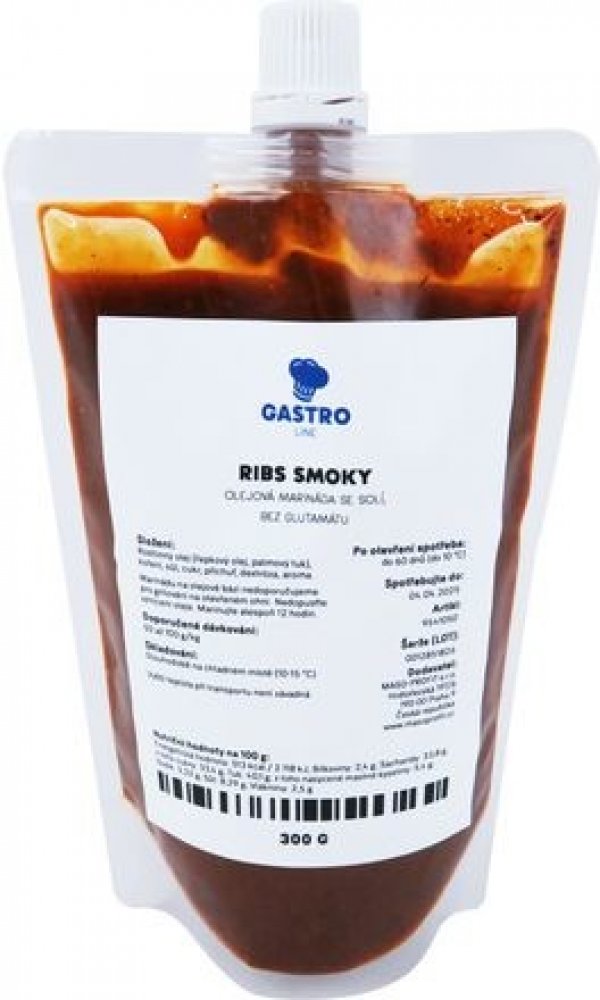 Kvalitní marináda od společnosti Gastro line je vhodná na vepřové, hovězí a ovčí maso, drůbež a zvěřinu.Upozornění: Marináda obsahuje rostlinné oleje, není tak vhodné maso grilovat na přímém plamenu.Dávkování: 70-100 gramů na kilo masaMarináda je vhodná na přípravu 3-4 kg masa.OG – bez glutamátSloženíRostlinné oleje a tuky (řepkový olej), jablečný sirup z cukrové řepy, koření, jedlá sůl, cukr, med, hydrolyzovaná rostlinná bílkovina, dextróza, extrakty koření, kouřové aroma.