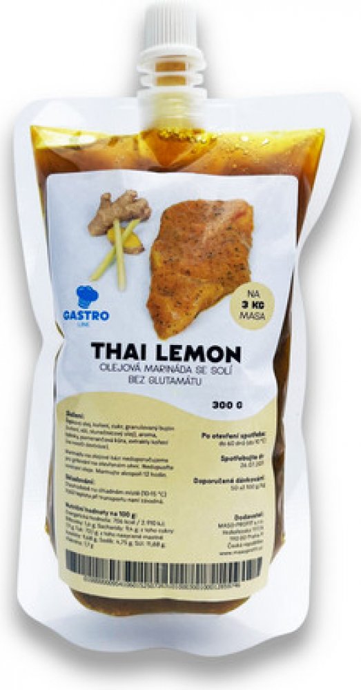 Thajská marináda z citronového koření se používá ke kořenění pikantních grilovaných masových specialit, smažených ragú a krájených mas.Marináda se hodí k drůbeži, rybám a zelenině.Upozornění: Marináda obsahuje rostlinné oleje, není tak vhodné maso grilovat na přímém plamenu.OG - bez glutamátuSložení: Řepkový olej, koření, cukr, granulovaný bujón (koření, sůl, slunečnicový olej), aroma, bylinky, pomerančová kůra, extrakty koření (na nosiči dextróze). Dávkování: 70-100 g/kgMarináda je vhodná na přípravu 3-4 kg masa.