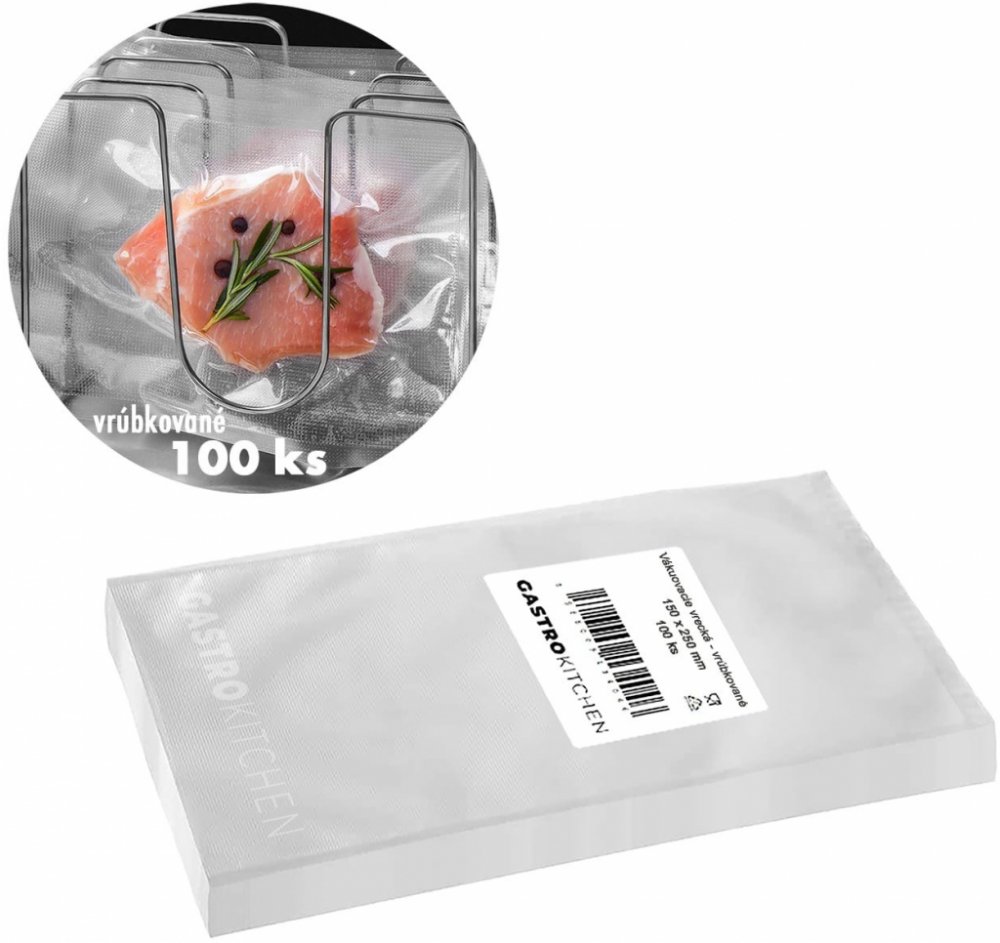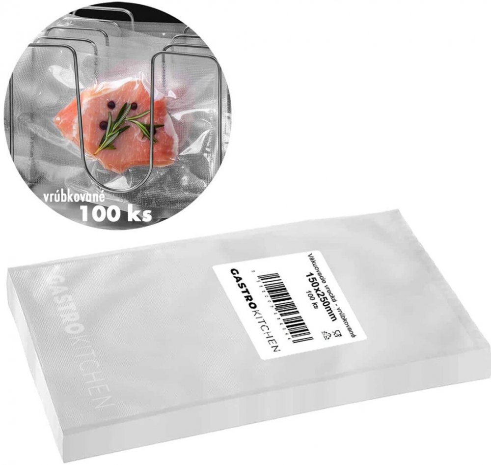 Vakuovací sáčky GASTROKITCHEN® 150 × 250 mm jsou navrženy tak, aby spolehlivě chránily potraviny při mražení, skladování i tepelném zpracování. Vroubkovaná struktura jedné strany sáčku zajišťuje bezproblémové odsávání vzduchu ve všech běžných vakuovačkách s vnějším odsáváním – od hobby modelů až po profesionální stroje v gastronomických provozech.