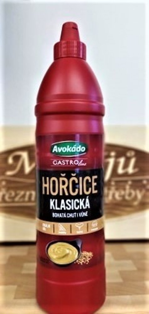Avokádo HOŘČICE klasická, GASTRO line- hmotnost 1000 gramůBez KONZERVANTŮ!Hořčice (plnotučná) má výraznou chuť, která se skvěle hodí k uzeninám a masu připravovaném na roštu. Krásně doladí i saláty, kterým dodá lehce pikantní chuť. Je taky vhodná jako základ pro přípravu marinád pro všechny druhy mas.Složení: pitná voda, hořčice bílá, ocet kvasný lihový, jedlá sůl, regulátor kyselosti: kyselina ci...