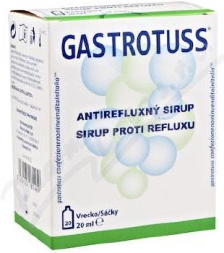 GASTROTUSS sirup je zdravotnický prostředek ve formě sirupu v sáčcích. Sirup s mechanickým účinkem, určený k léčbě gastroezofageálního refluxu. Zmírňuje symptomy onemocnění: kyselé nebo zásadité zvracení, pálení žáhy, pocit cizího tělesa v krku, zánět nosohltanu, říhání, pocit napětí v břiše, kašel, změna hlasu.