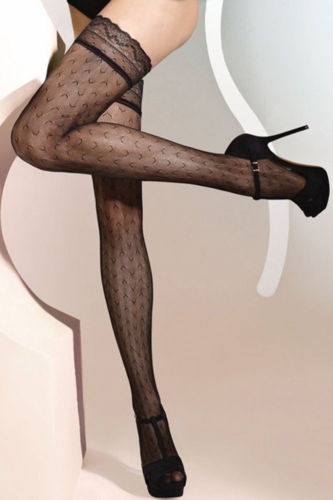 Maribel 05- exkluzivní samodržící vzorované punčochy, s elegantní krajkou s dvěmi silikonovými pásky.Velmi atraktivní vzor. Vyrobené z příze s podílem elastanu.