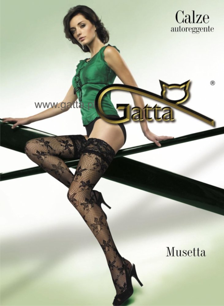 Musetta- samodržící vzorované síťované punčochy, s elegantní krajkou a silikonovým páskem.Velmi elegantní a zajímavé. Vyrobené z příze s podílem elastanu.
