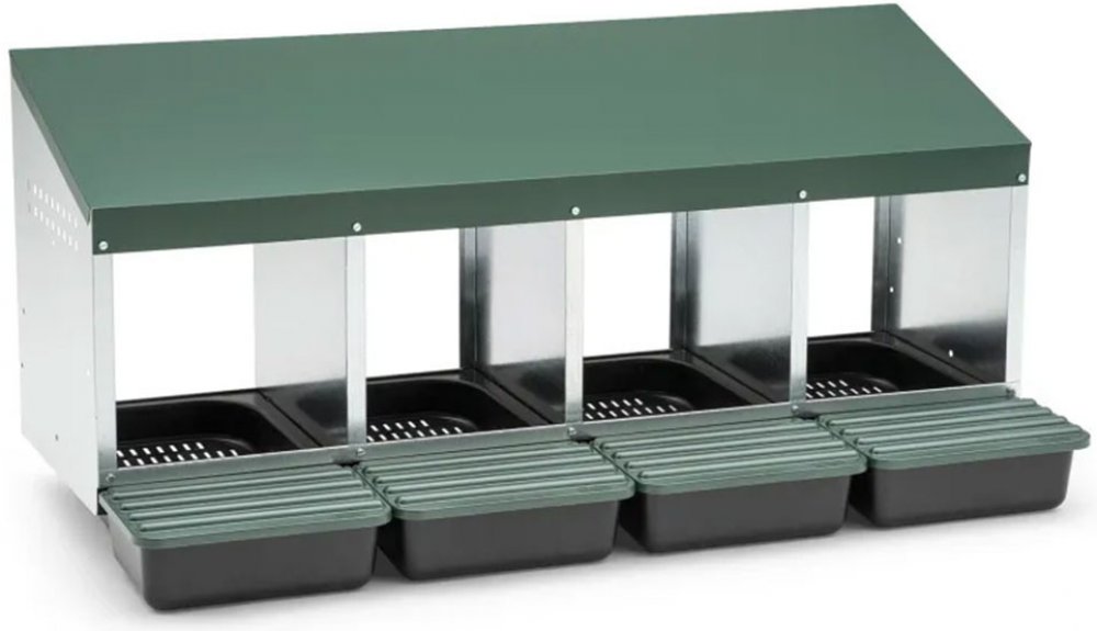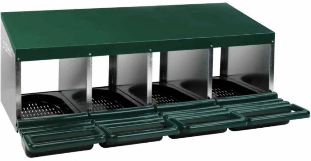 Snáškové hnízdo pro čtyři nosnice Snáškové hnízdo pro čtyři nosnice je praktickým a hygienickým řešením pro chov slepic. Toto pozinkované snáškové hnízdo je navrženo tak, aby poskytlo čtyři prostory pro současně snášející nosnice, což zajišťuje dostatečný prostor pro hejno až 20 slepic. Díky spádovanému dnu se vejce automaticky odkutálí do spodní části, kde jsou chráněna před zašpiněním a rozbitím...