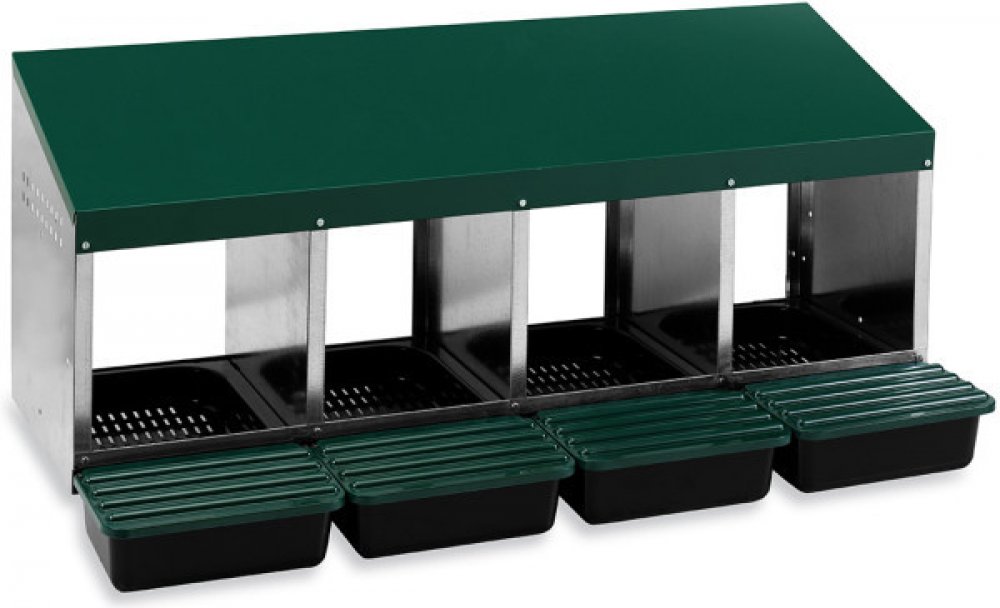 Snáškové hnízdo pro slepice se sběrným košíkem na vejce - GAUN čtyřmístnéSnáškové hnízdo pro slepice se sběrným košíkem na vejce čtyřmístné, kapacita až 20 nosnic (5 nosnic na jednu kukaň), dno hnízda je spádované, vejce se samo odkutálí do sběrného košíku, vyrobené z pozinkovaného kovu s plastovým dnem, barva zelená. Hnízdo můžete jednoduše postavit v kurníku na zem nebo zavěsit na zeď, velice sn...