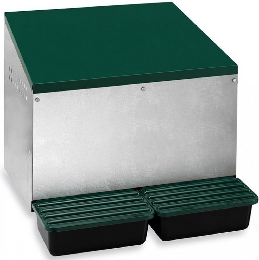 Venkovní snáškové hnízdo pro slepice se sběrným košíkem na vejce dvoumístné, až pro 10 nosnic (5 nosnic na jednu kukaň), dno hnízda je spádované, vejce se samo odkutálí do sběrného košíku, vyrobené z pozinkovaného kovu s plastovým dnem, barva zelená. Jednoduché připevnění z vnější části kurníku, velice snadná údržba č...