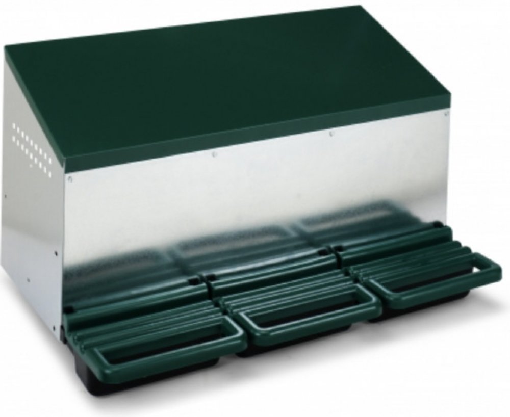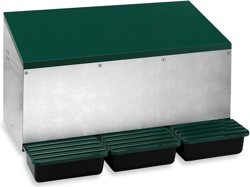 Venkovní snáškové hnízdo pro slepice se sběrným košíkem na vejce trojmístné, až pro 15 nosnic (5 nosnic na jednu kukaň), dno hnízda je spádované, vejce se samo odkutálí do sběrného košíku, vyrobené z pozinkovaného kovu s plastovým dnem, barva zelená. Jednoduché připevnění z vnější části kurníku, velice snadná údržba čistoty, rozměry:48 cm délka x 79,7 cm šířka x& 52 cm výška.
