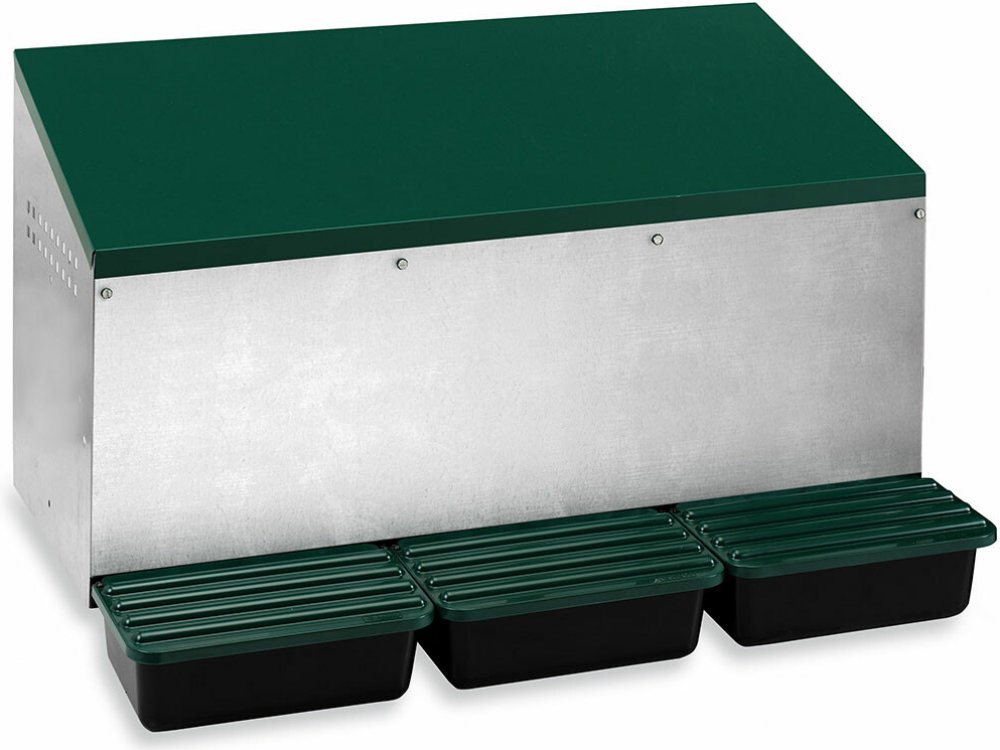 Venkovní snáškové hnízdo pro slepice se sběrným košíkem na vejce trojmístné, až pro 15 nosnic (5 nosnic na jednu kukaň), dno hnízda je spádované, vejce se samo odkutálí do sběrného košíku, vyrobené z pozinkovaného kovu s plastovým dnem, barva zelená. Jednoduché připevnění z vnější části kurníku, velice snadná údržba č...