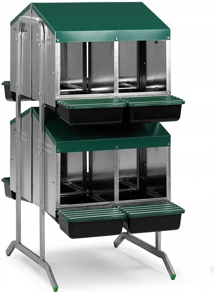 Snáškové hnízdo pro slepice se sběrným košíkem na vejce 8-místné na nožičkách, kapacita až 40 nosnic (5 nosnic na jednu kukaň), dno hnízda je spádované, vejce se samo odkutálí do sběrného košíku, vyrobené z pozinkovaného kovu s plastovým dnem, barva zelená. Hnízdo můžete jednoduše postavit v kurníku na zem, velice snadná údržba čistoty, rozměry: 105,5 cm délka x 56 cm šířka x 121 cm výška.