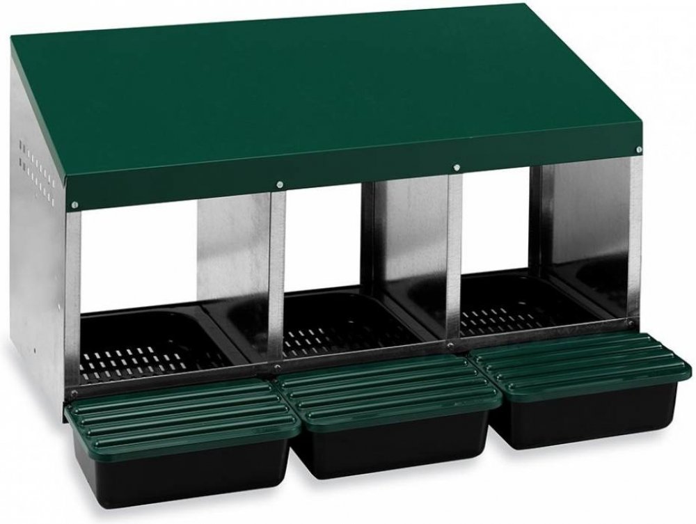 Snáškové hnízdo pro slepice se sběrným košíkem na vejce, trojmístné, až pro 15 nosnic, umístění na zem nebo na zeď, snadná údržba. Jedná se o skvělého pomocníka každého chovatele drůbeže. Snáškové hnízdo zamezí rozbíjení a znečišťování vajec, jelikož dno snáškového hnízda je spádové. Vejce se tedy po snesení odkutálí do zásobníku, ze kterého si čistá a nepoškozená vejce pouze jednoduše odeberete. Kukaň můžete jednoduše umístit na zem v kurníku nebo zavěsit na zeď. Hnízdo vyrobené z pozinkovaného kovu se dnem z kvalitního plastu je velice odolné vůči nečistotám, a tak jeho údržba a dezinfekce zabere jen chvilku. Rozměry hnízda: D 48 cm x Š 79,7 cm x V 52 cm.