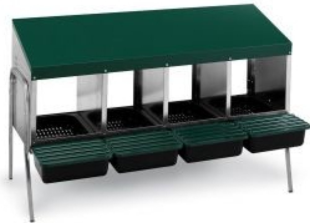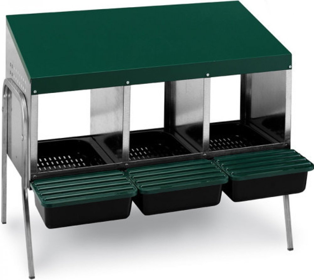Snáškové hnízdo pro slepice se sběrným košíkem na vejce, trojmístné na nožičkách, až pro 15 nosnic, kovové, na zem, snadná údržba. Jedná se o skvělého pomocníka každého chovatele drůbeže. Snáškové hnízdo zamezí rozbíjení a znečišťování vajec, jelikož dno snáškového hnízda je spádové. Vejce se tedy po snesení odkutálí do zásobníku, ze kterého si čistá a nepoškozená vejce pouze jednoduše odeberete. ...