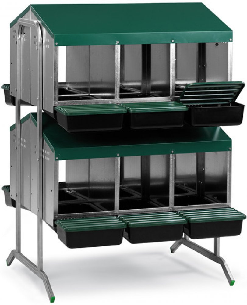 Snáškové hnízdo pro slepice se sběrným košíkem na vejce 12-místné na nožičkách, kapacita až 60 nosnic (5 nosnic na jednu kukaň), dno hnízda je spádované, vejce se samo odkutálí do sběrného košíku, vyrobené z pozinkovaného kovu s plastovým dnem, barva zelená. Hnízdo můžete jednoduše postavit v kurníku na zem, velice snadná údržba čistoty, rozměry: 105,5 cm délka x 82,7 cm šířka x 121 cm výška.