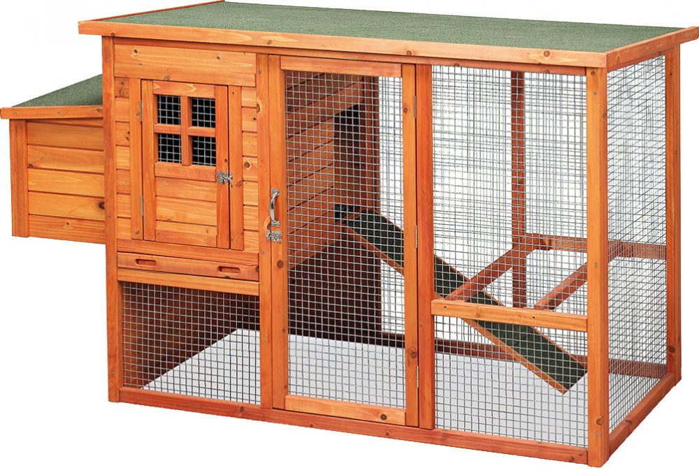 Kurník pro slepice GAUN LYONDřevěný kurník s výběhem, pro 3 - 5 ks nosnic, ze smrkového dřeva, vodotěsná střecha, boční prostorné dvířka s rampou, výsuvné dno pro snadné čištění, 2 vodotěsná snášková hnízda, 2 venkovní hřadyvelká přední dvířka pro snadný přístup, rozměry 1905x755x1040 mm.Kurník snadno složíte pomocí přehledného obrázkového návodu.Rozměry kurníku pro slepice